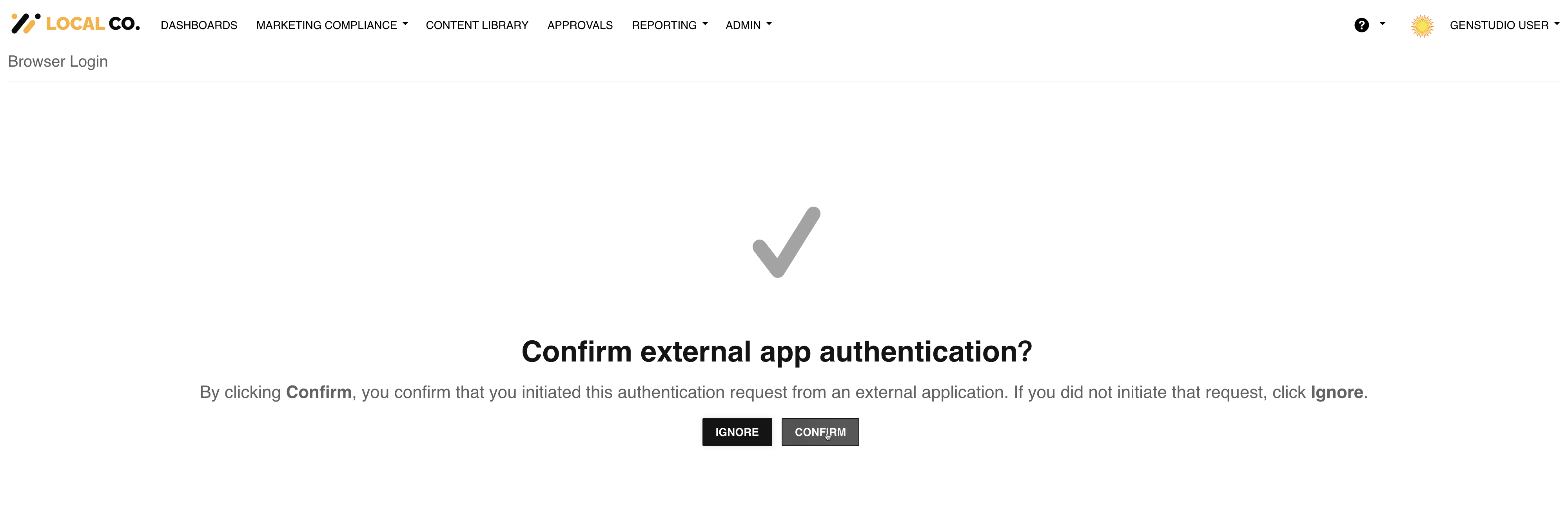 Login as you would normally, either via username/password or single sign-on. You will then be prompted to confirm the external app authentication. Click Confirm.