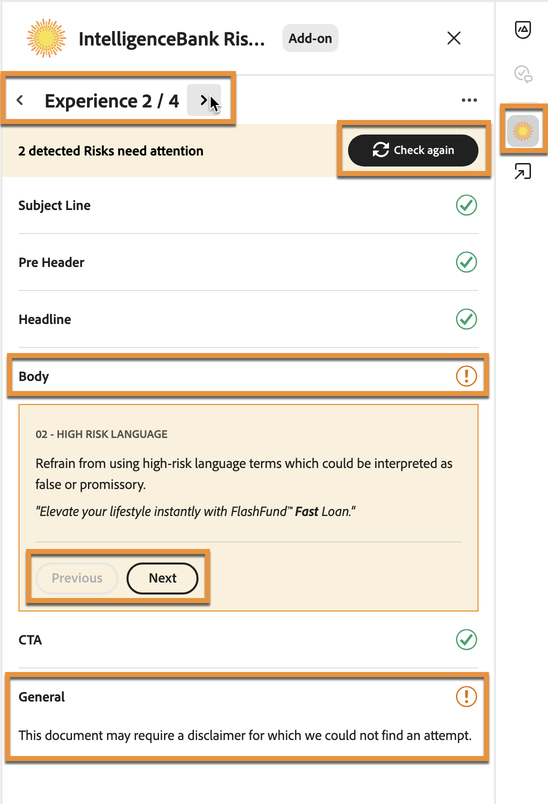 - Upon login, the text copy generated or edited will automatically be sent for risk review (if it has not been reviewed before). If any risks are detected, they will be displayed in the side panel against each experience (see the arrows at the top of the panel to navigate between Experiences). As you make edits to the content, you can click Check again to initiate the review again for the latest version of the content copy, until all risks are addressed.