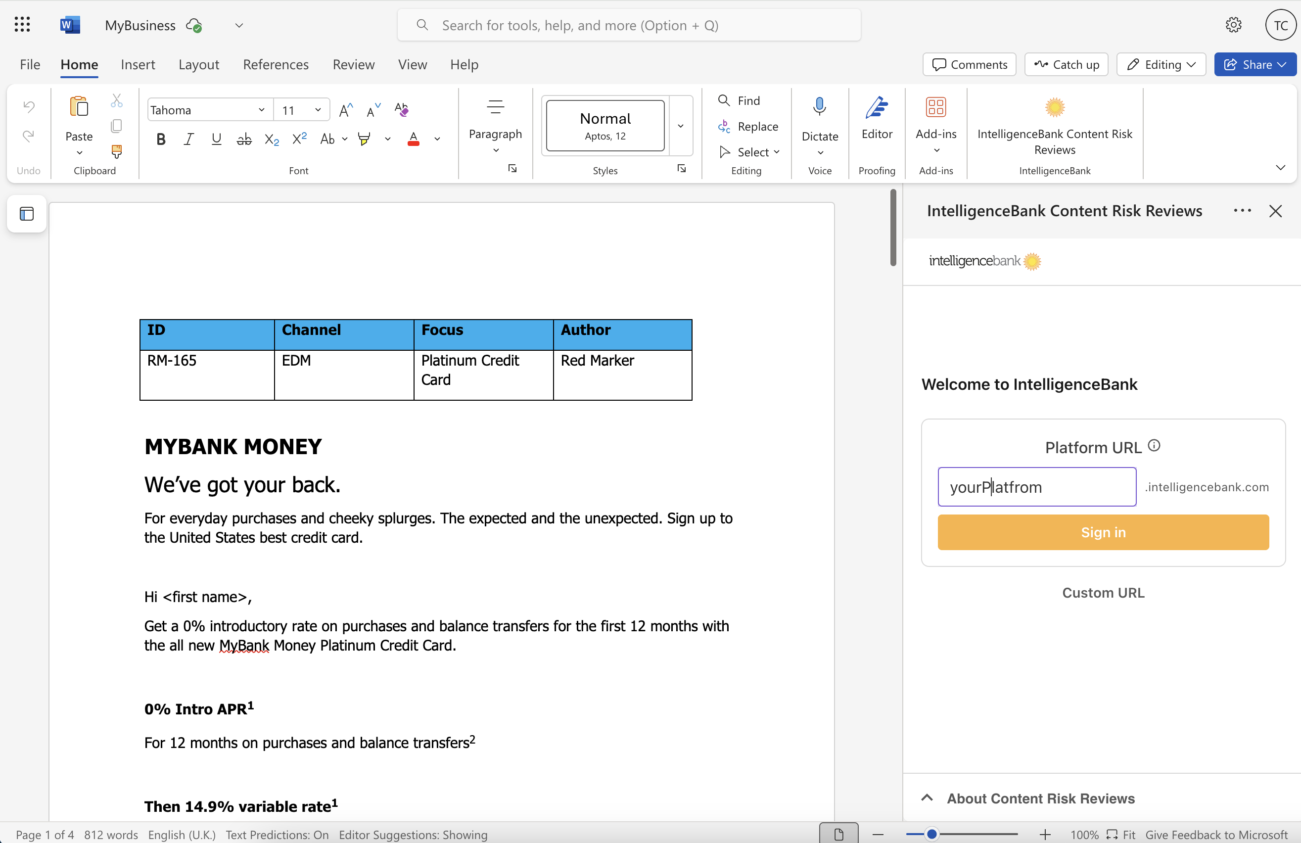 - Click the IntelligenceBank Content Risk Reviews Add-in icon in your Word ribbon to launch the tool