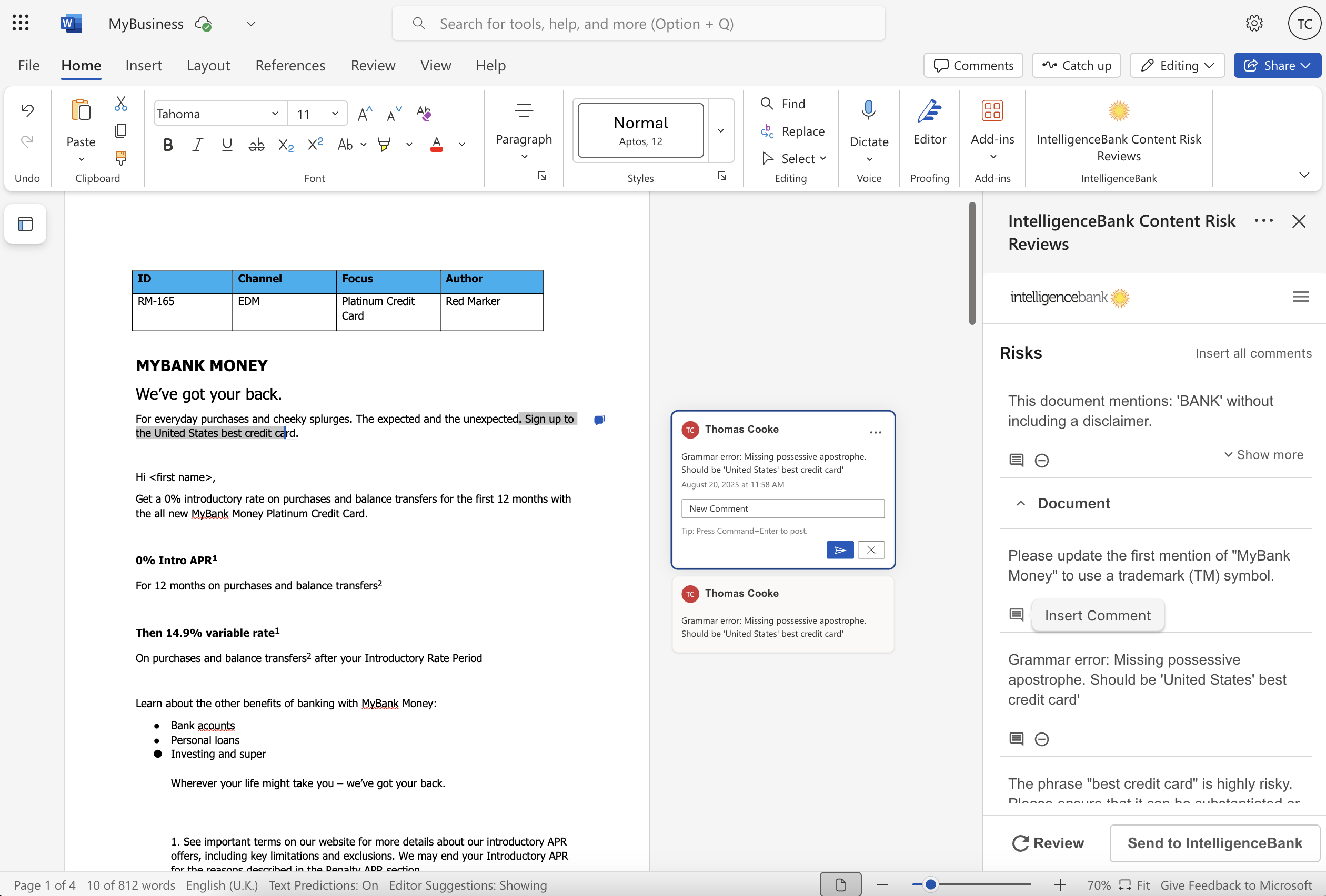 - Inserted comments make it easy to share feedback with colleagues who may not have access to the IntelligenceBank Content Risk Reviews Add-in