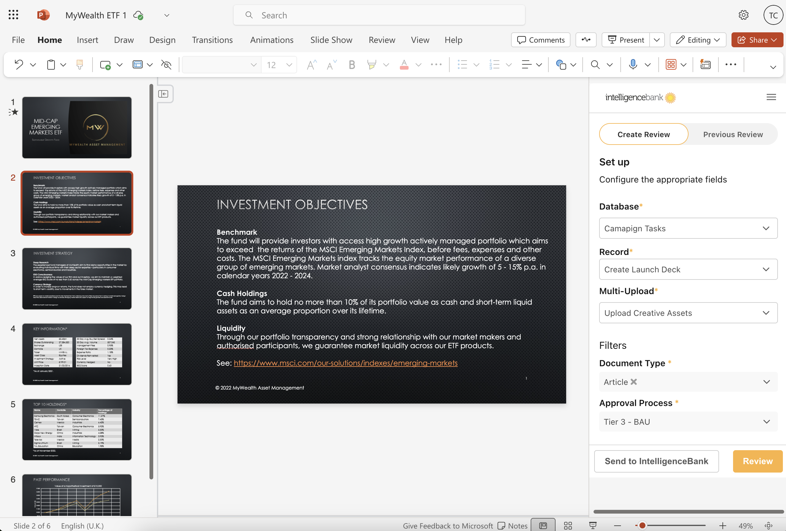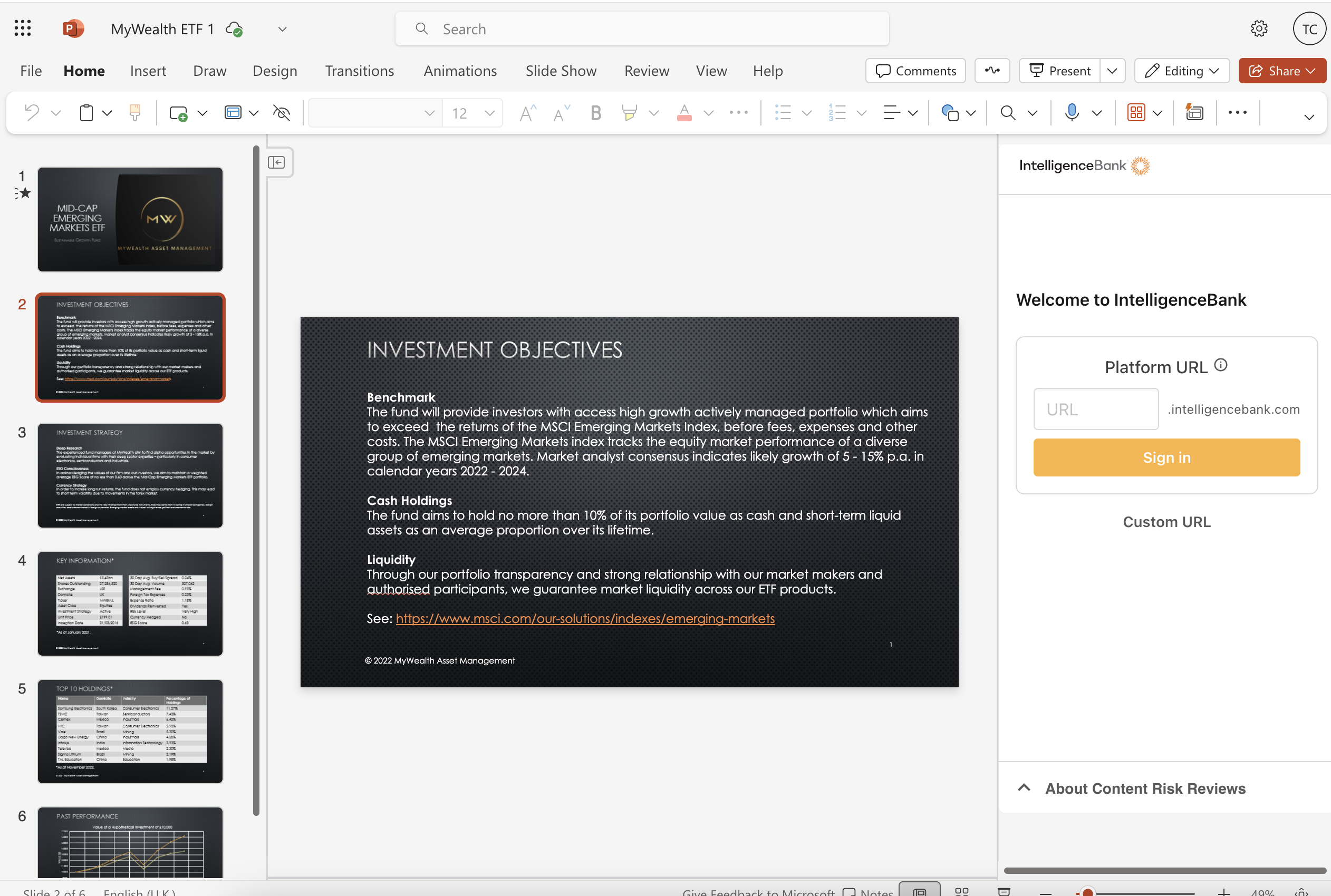 This guide explains how to use the Content Risk Reviews Add-in to check your presentations and upload them to IntelligenceBank.