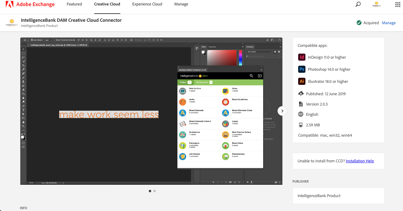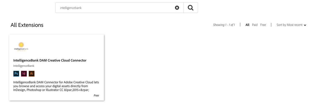 You can download the add-on from the IntelligenceBank Adobe Exchange page, or search for "IntelligenceBank" on the Adobe Exchange Marketplace