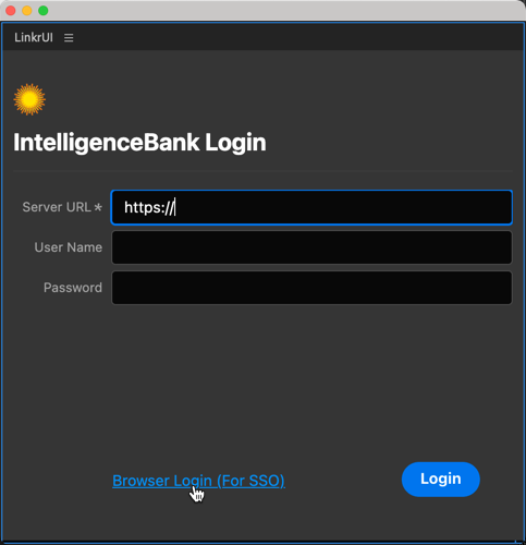- Once the plug-in is activated, you will be prompted to authenticate to your IntelligenceBank platform. Enter your platform URL, username and password. To login using Single Sign On, enter the platform URL, and then click the Browser Login option to initiate the process.
