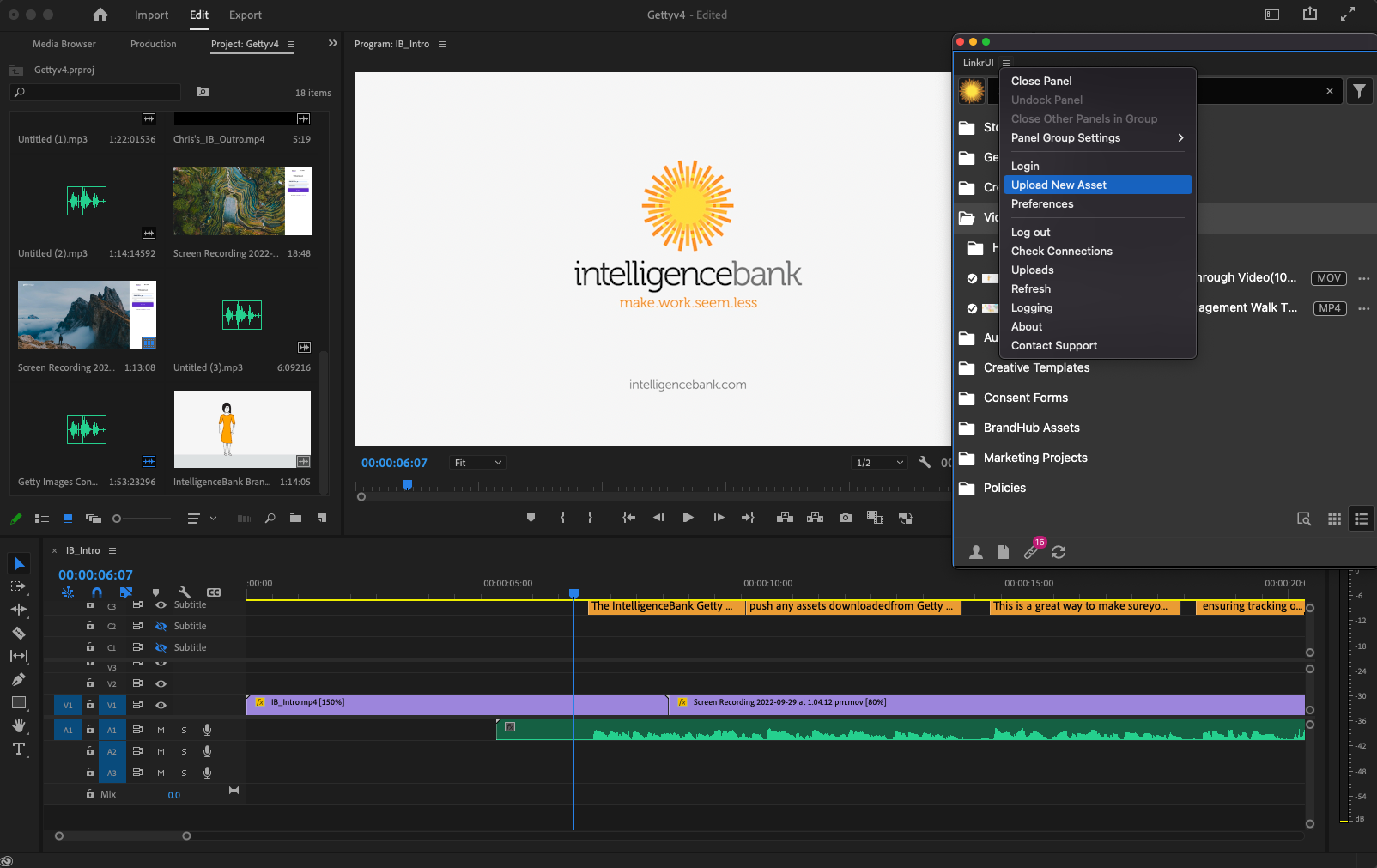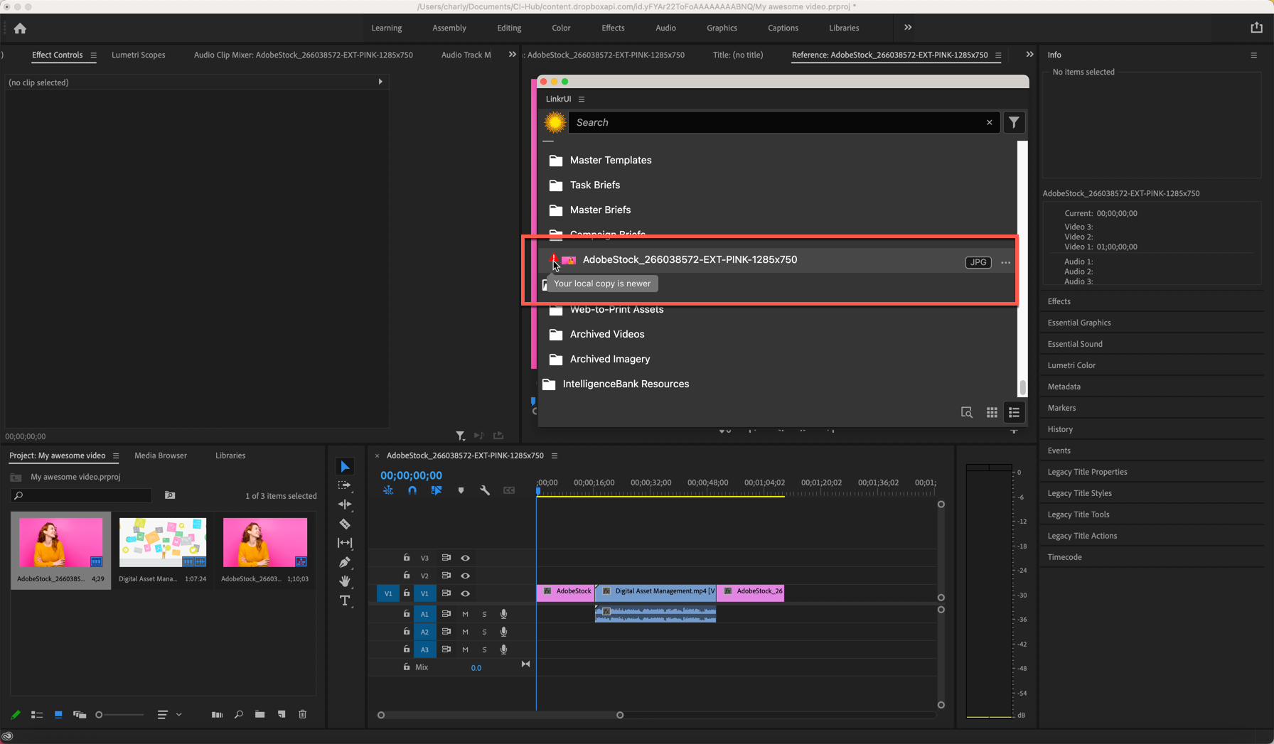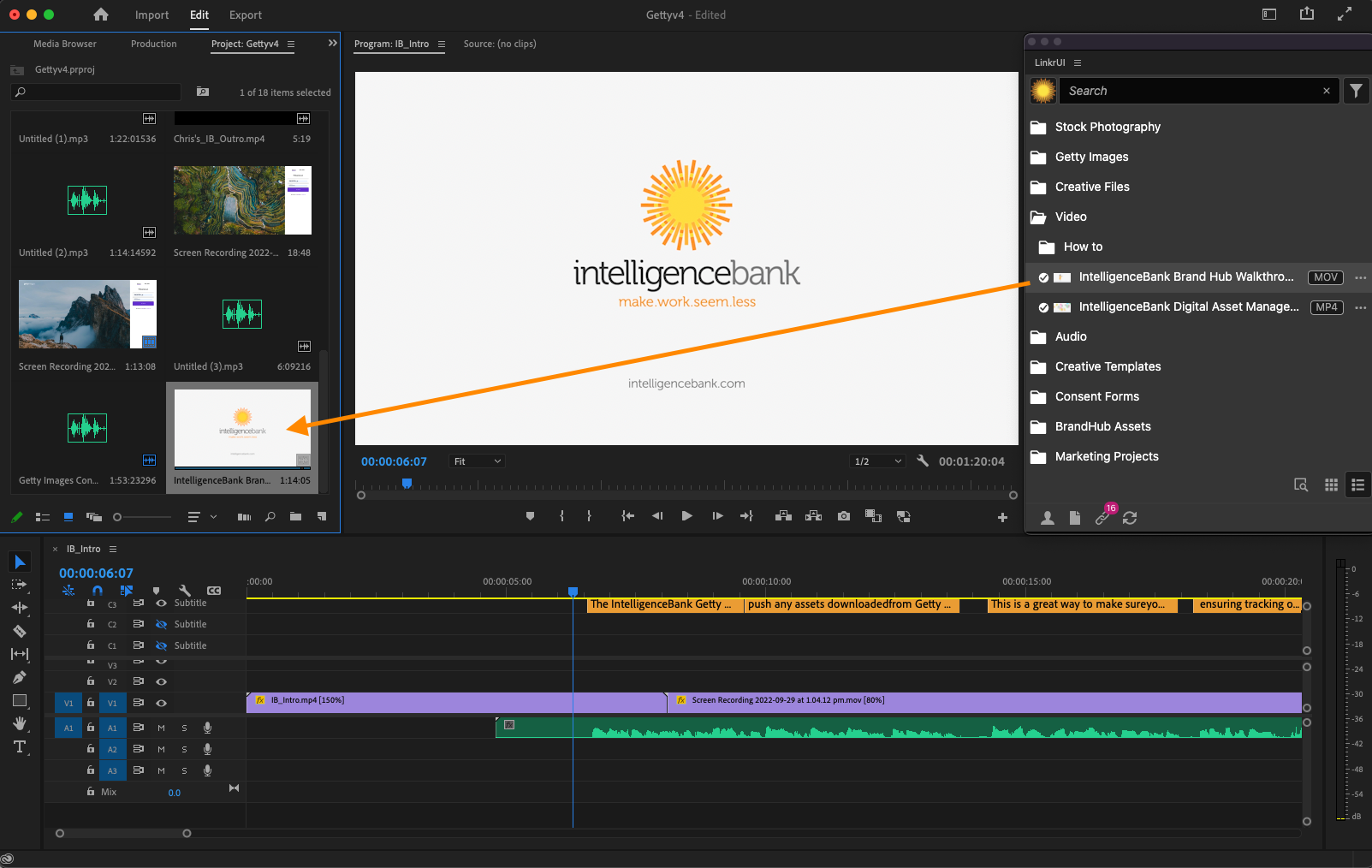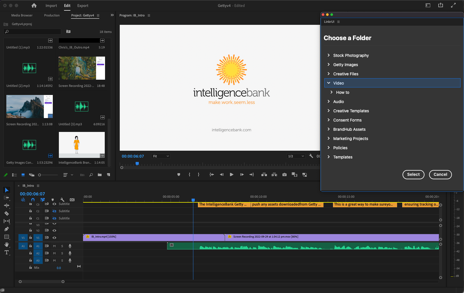 The LinkrUI Adobe Connector makes it easy to access your approved IntelligenceBank DAM assets directly from within Adobe Premiere Pro or Adobe After Effects.