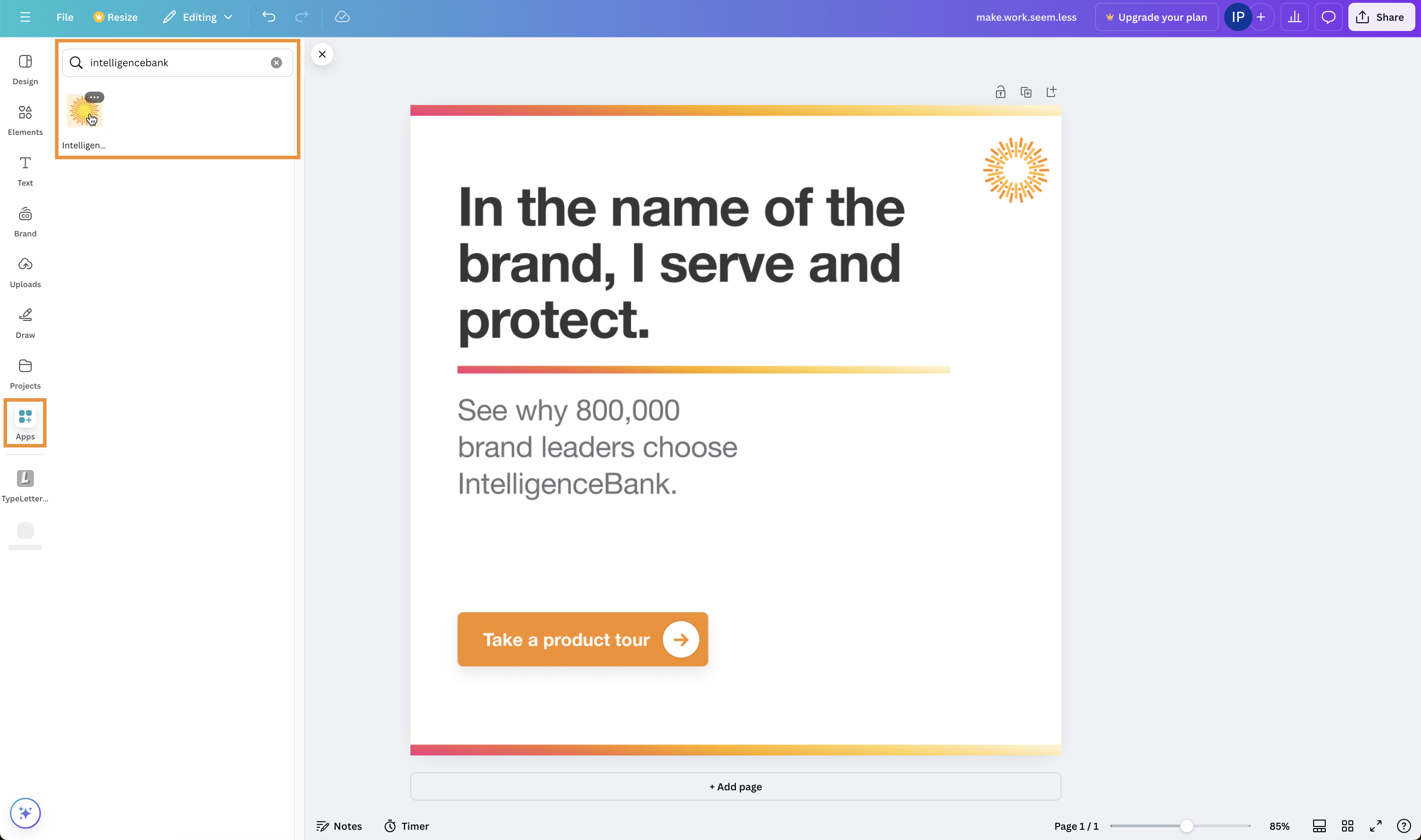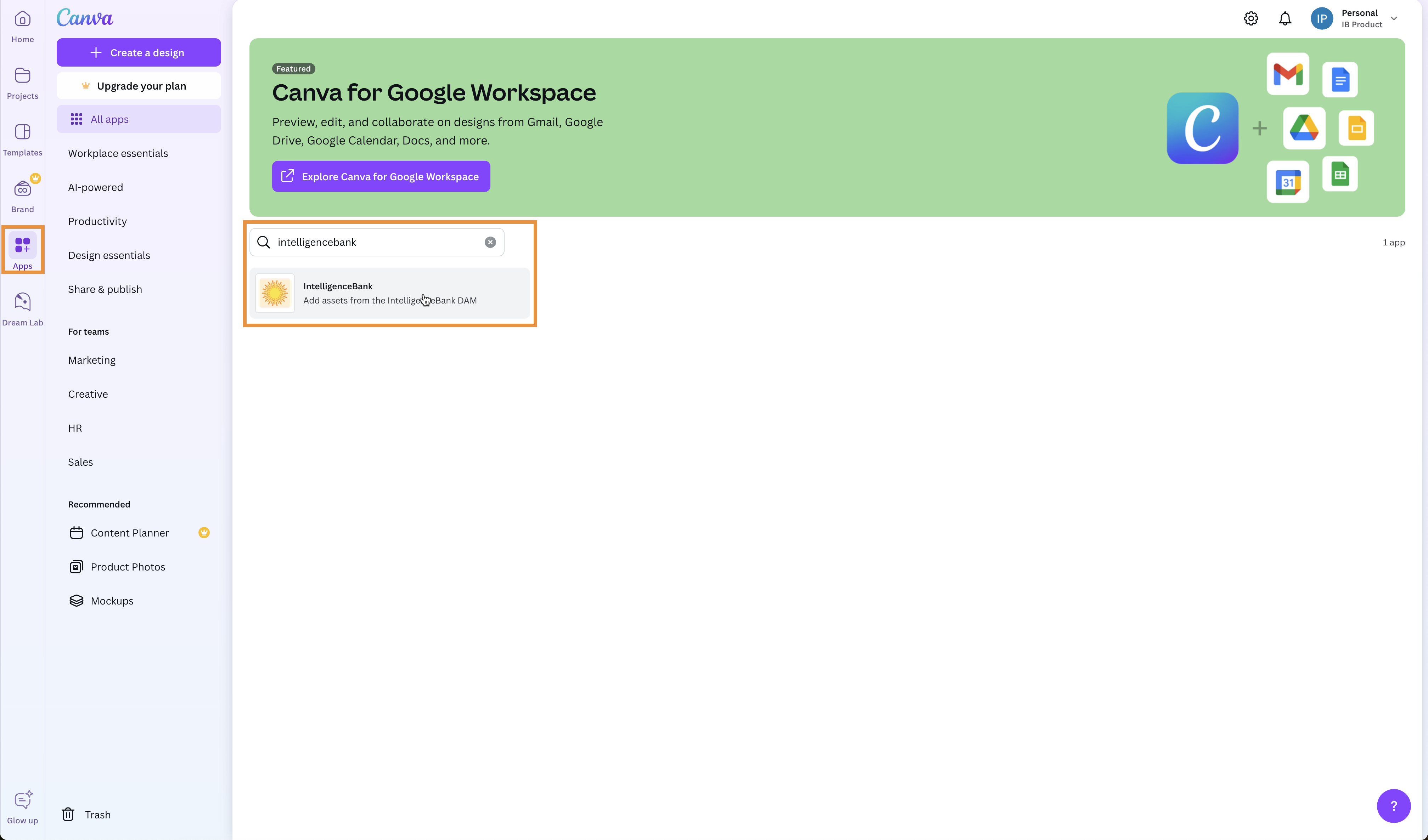 Under Apps, search for "intelligencebank" and click on the IntelligenceBank app that comes up as the result to install it.