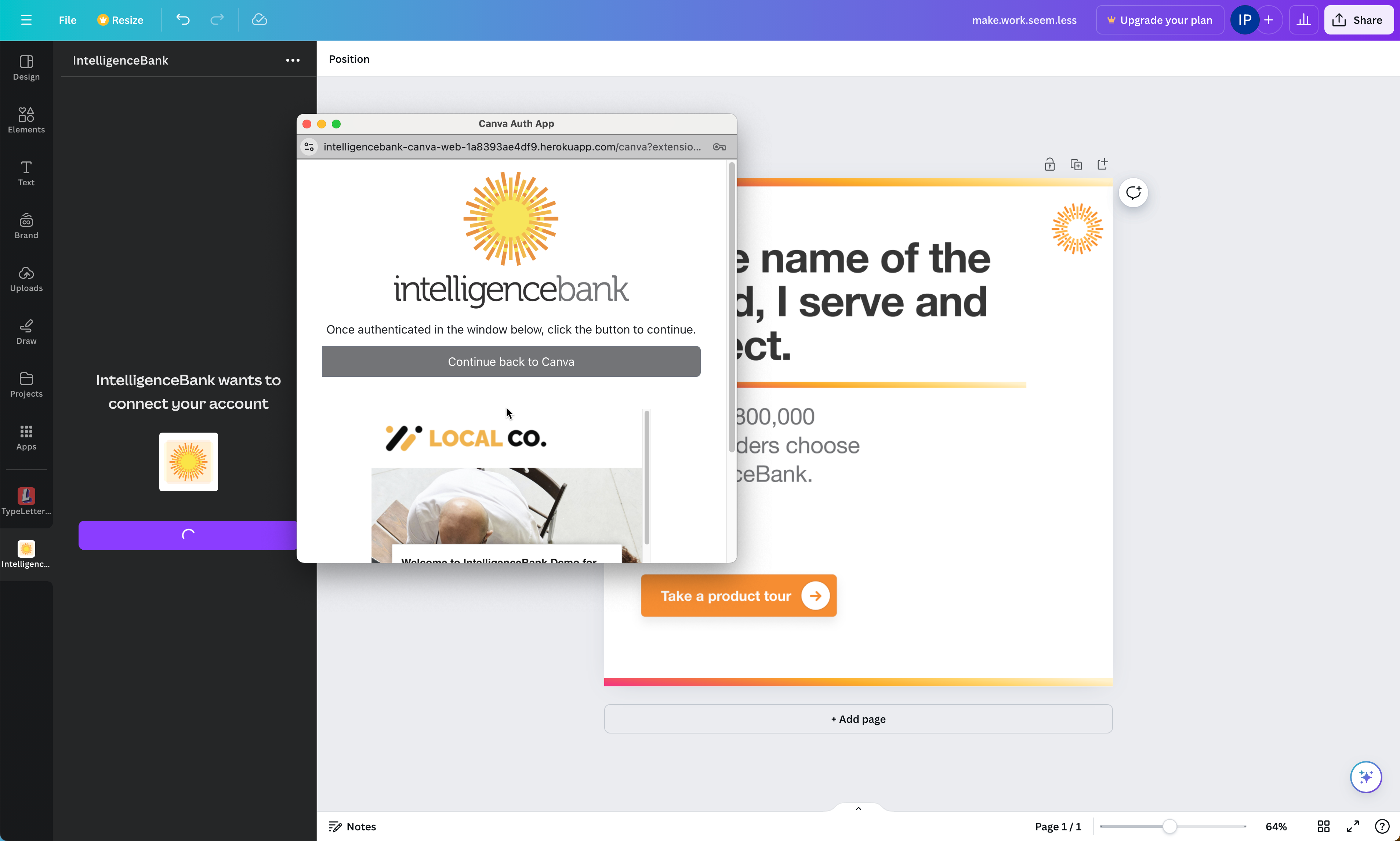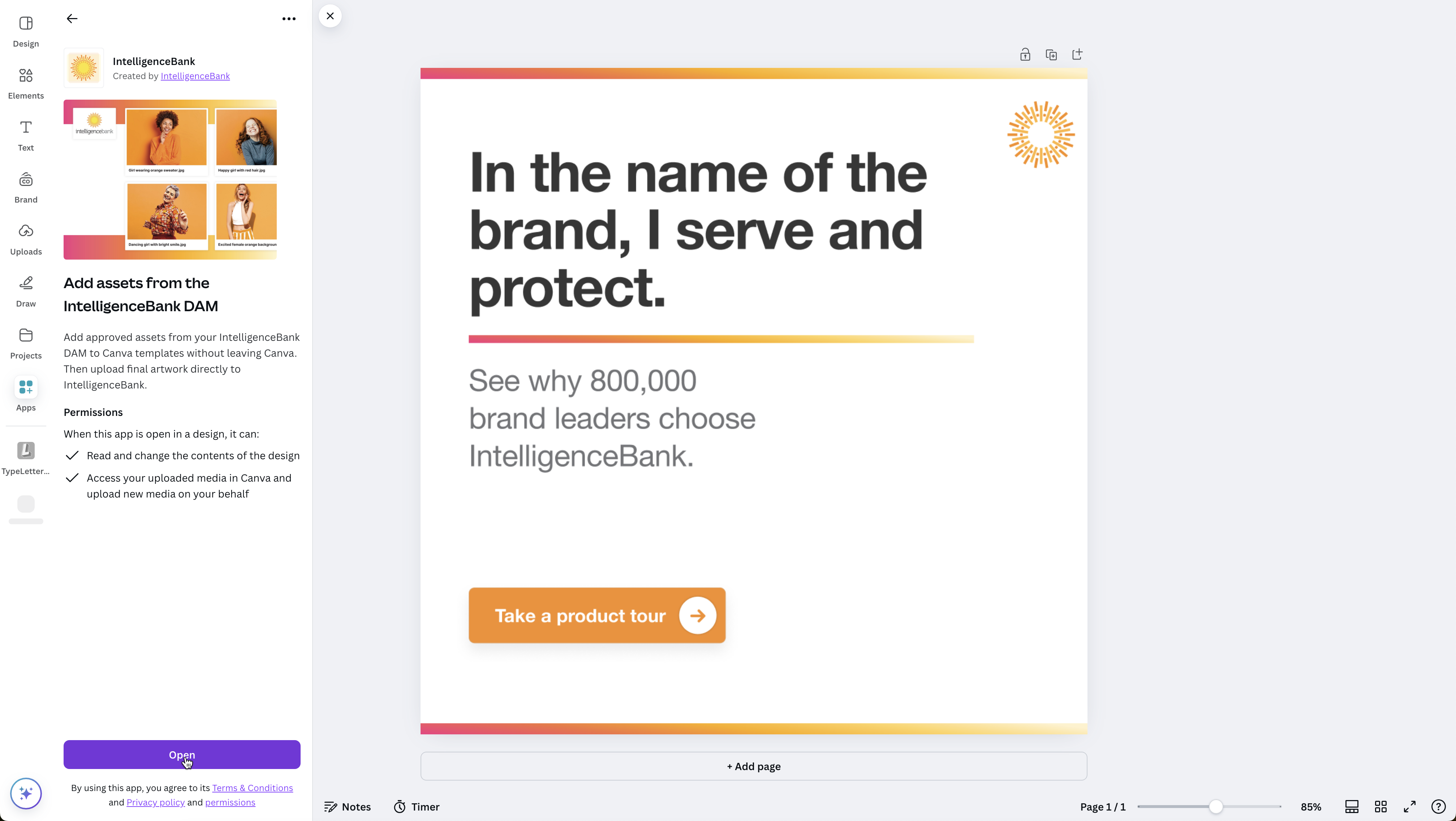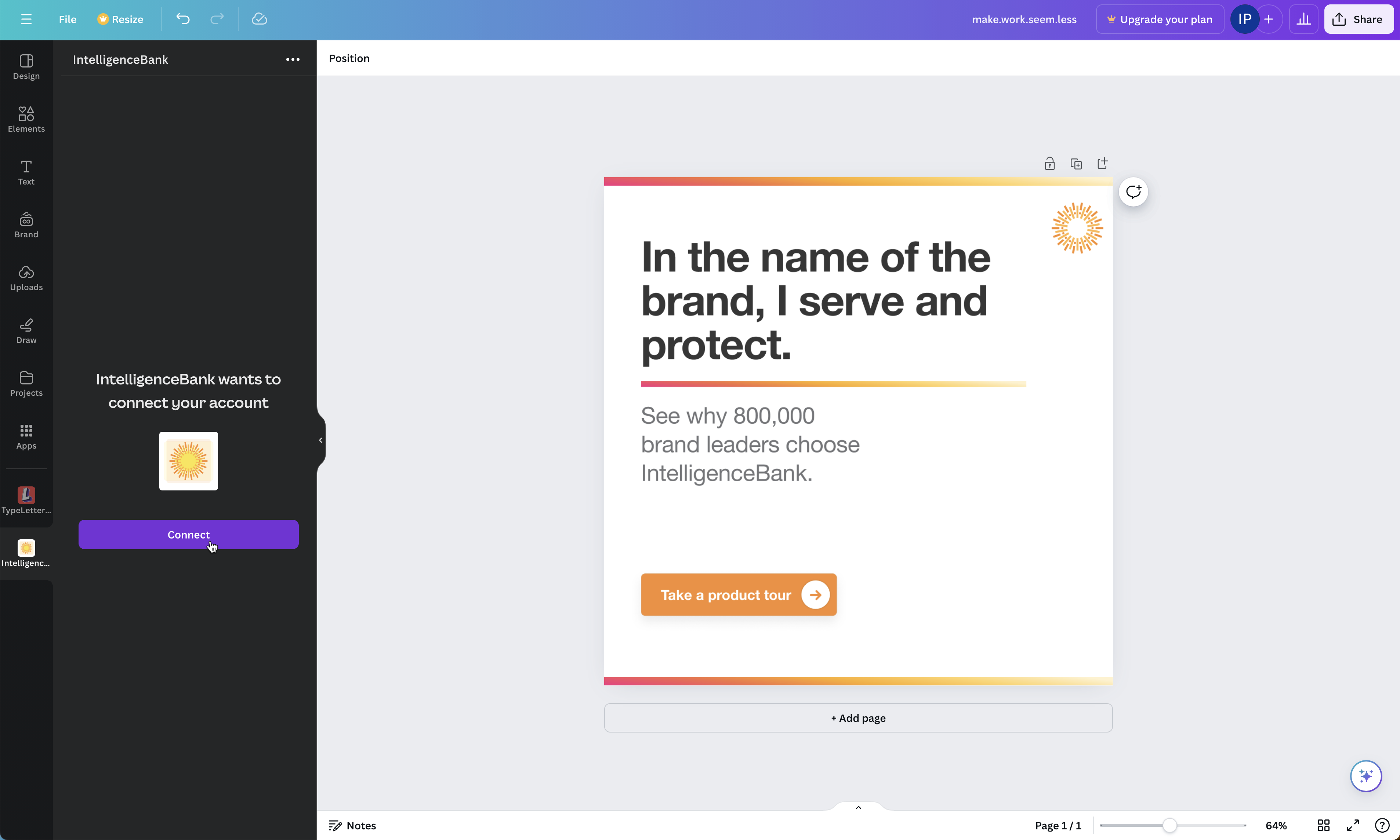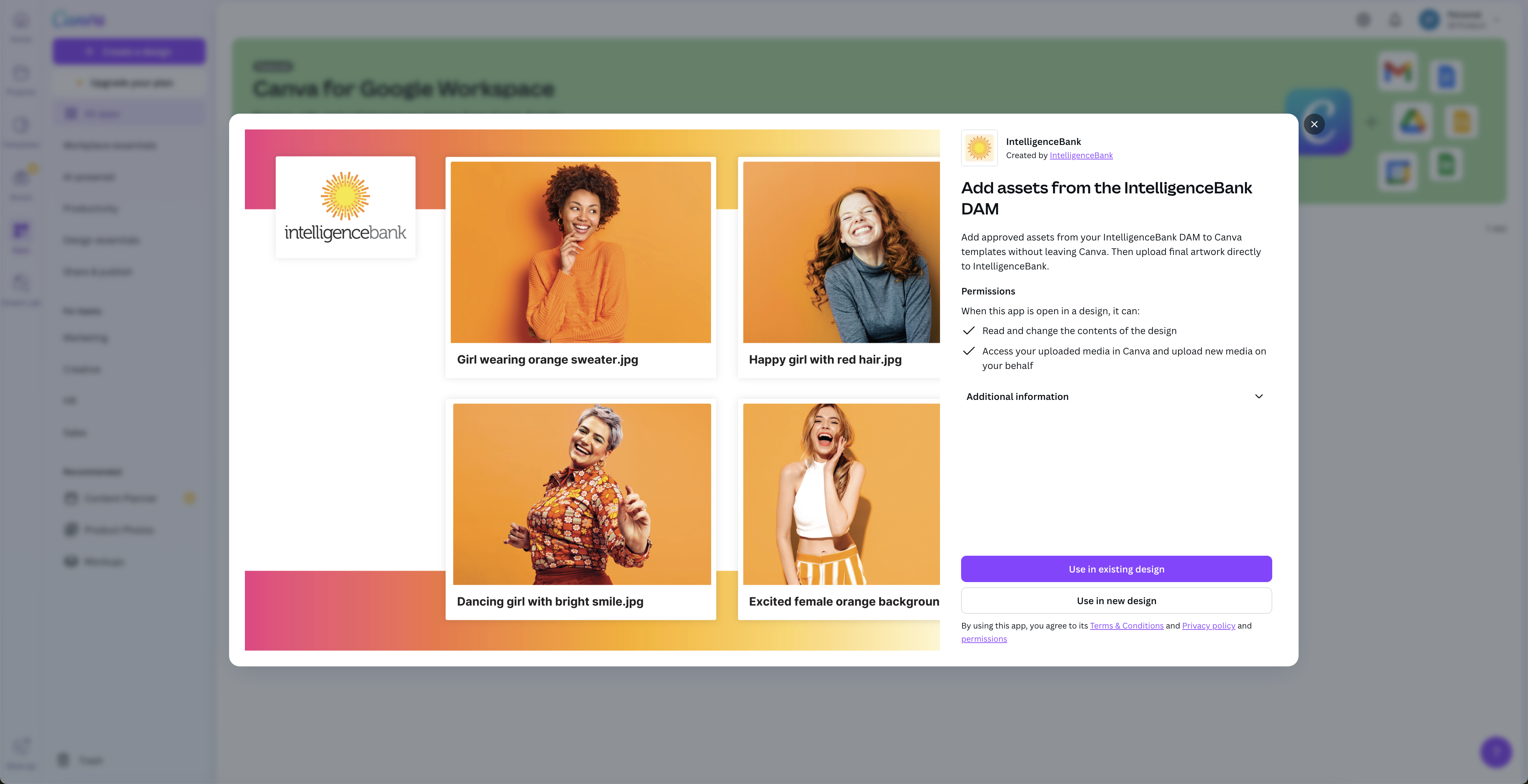The Intelligencebank Assets Connector (or "app") for Canva makes it easy for designers to search, browse and insert approved image, video or audio assets from IntelligenceBank into their designs, and publish those designs back to IntelligenceBank, directly from within Canva.