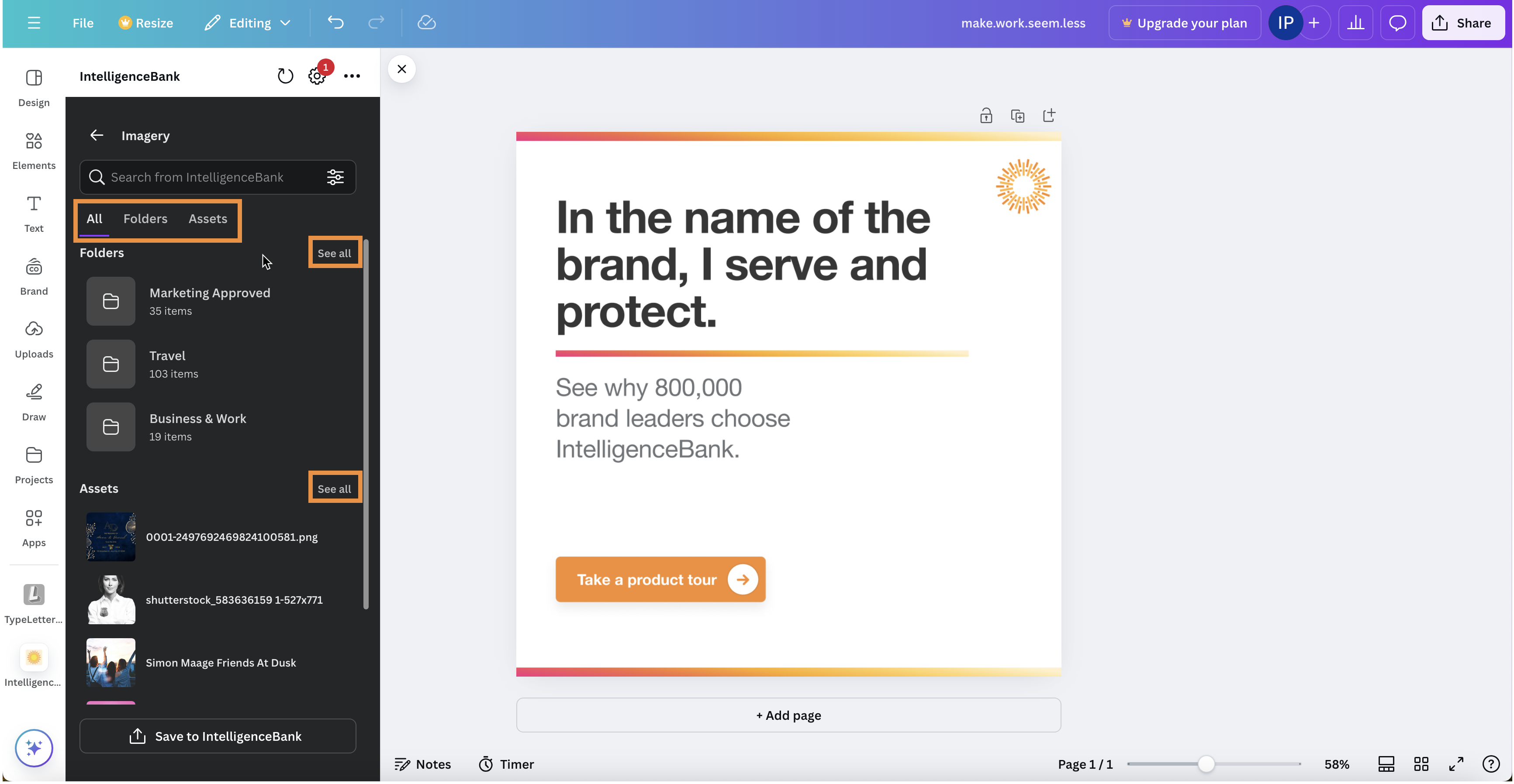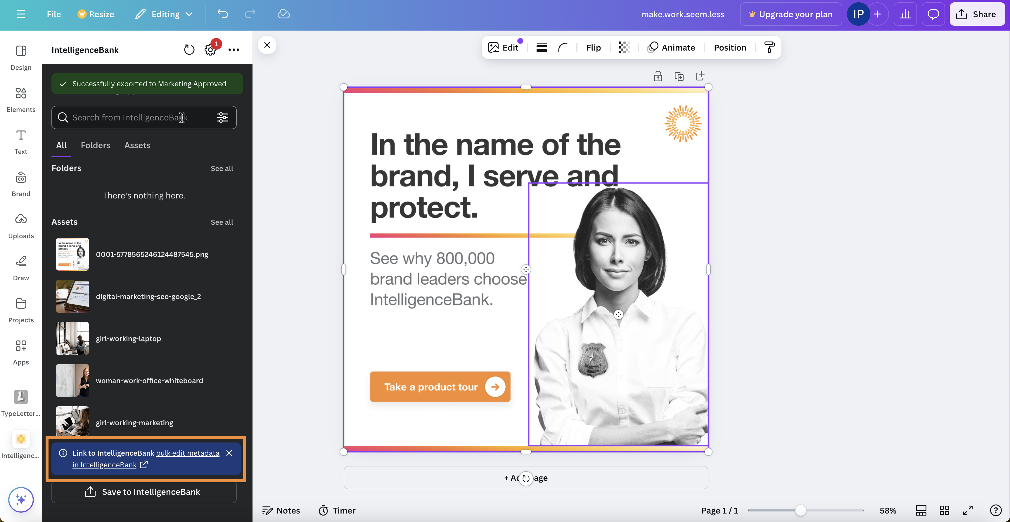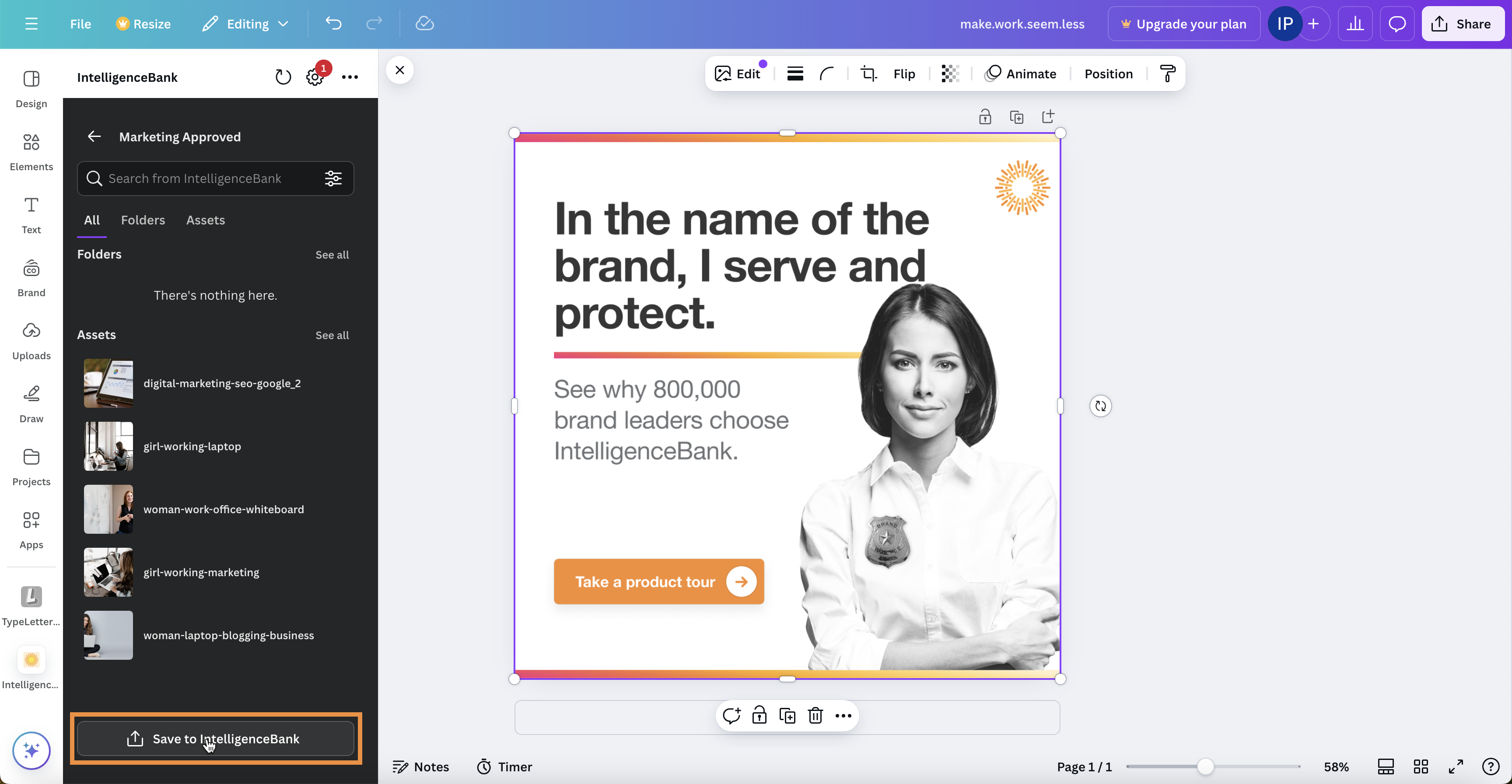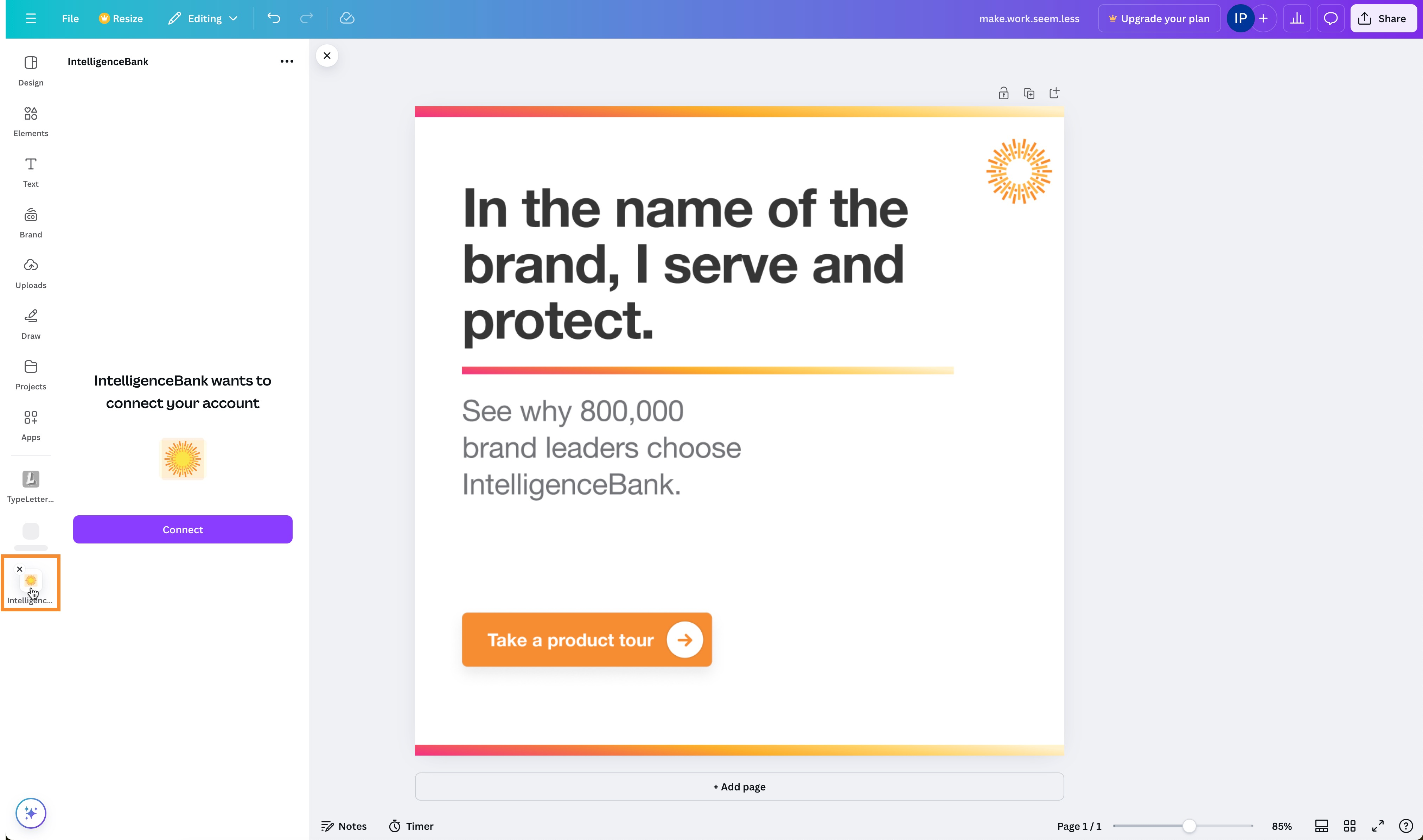 The Intelligencebank Assets Connector (or "app") for Canva makes it easy for designers to search, browse and insert approved image, video or audio assets from IntelligenceBank into their designs, and publish those designs back to IntelligenceBank, directly from within Canva.