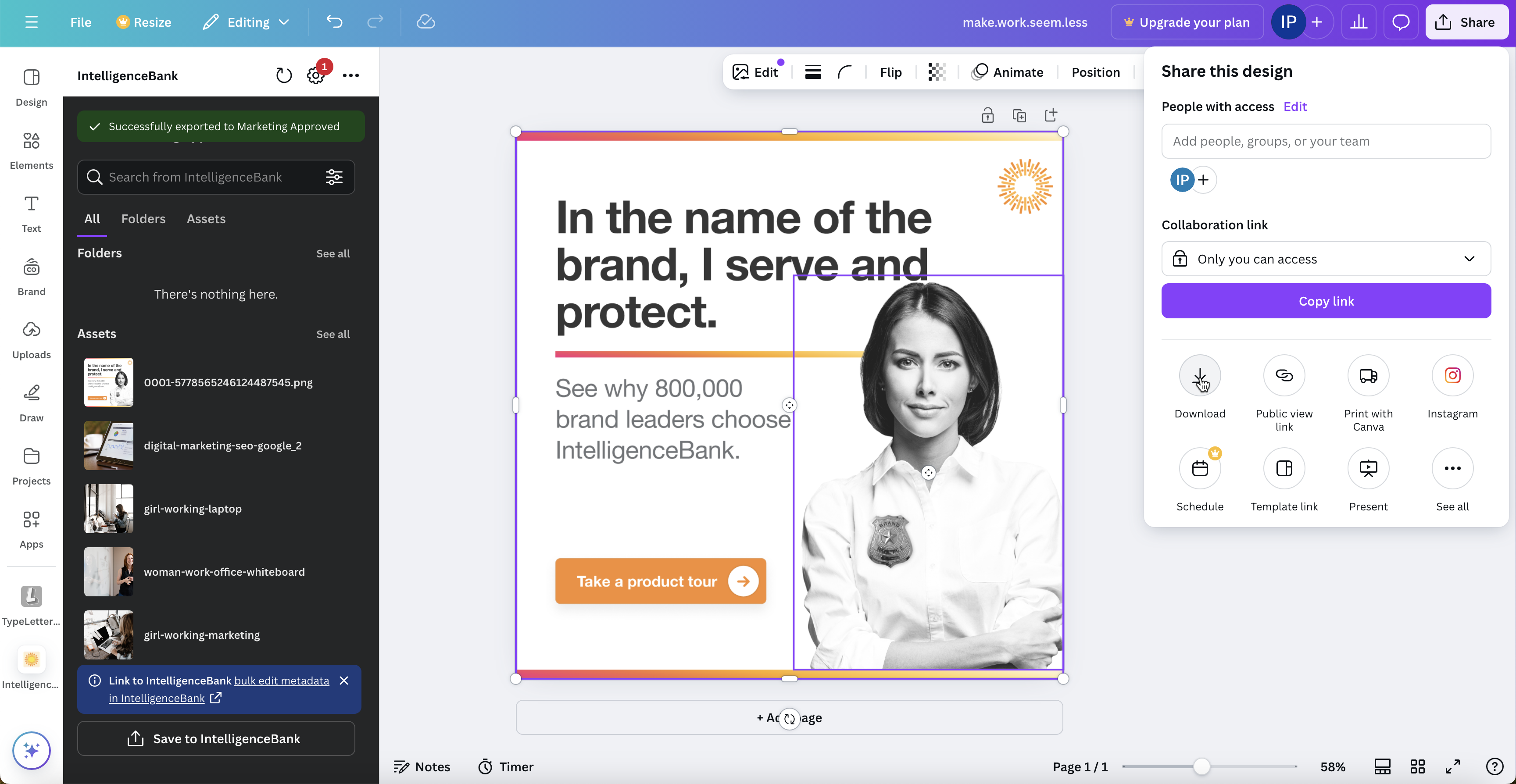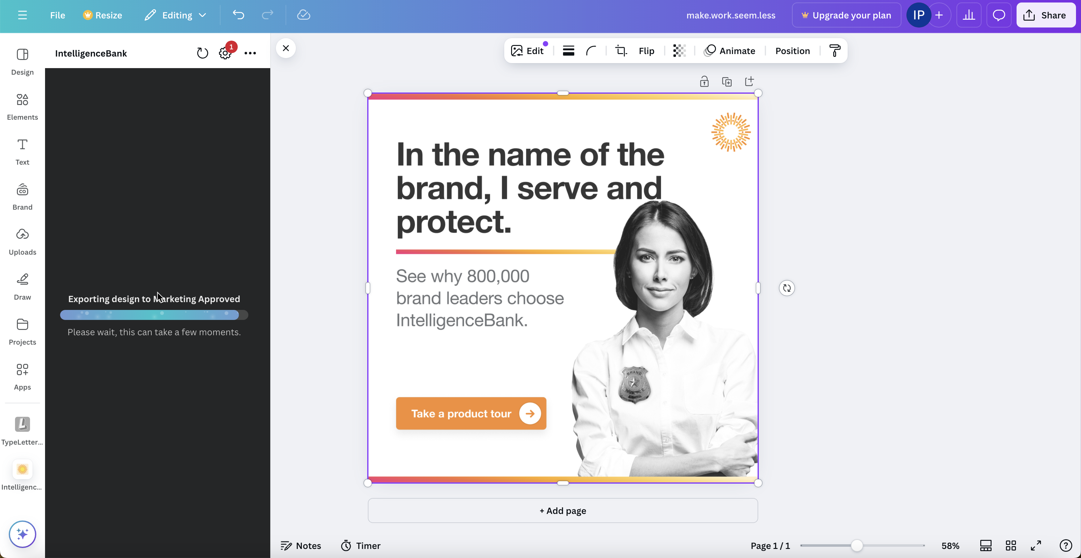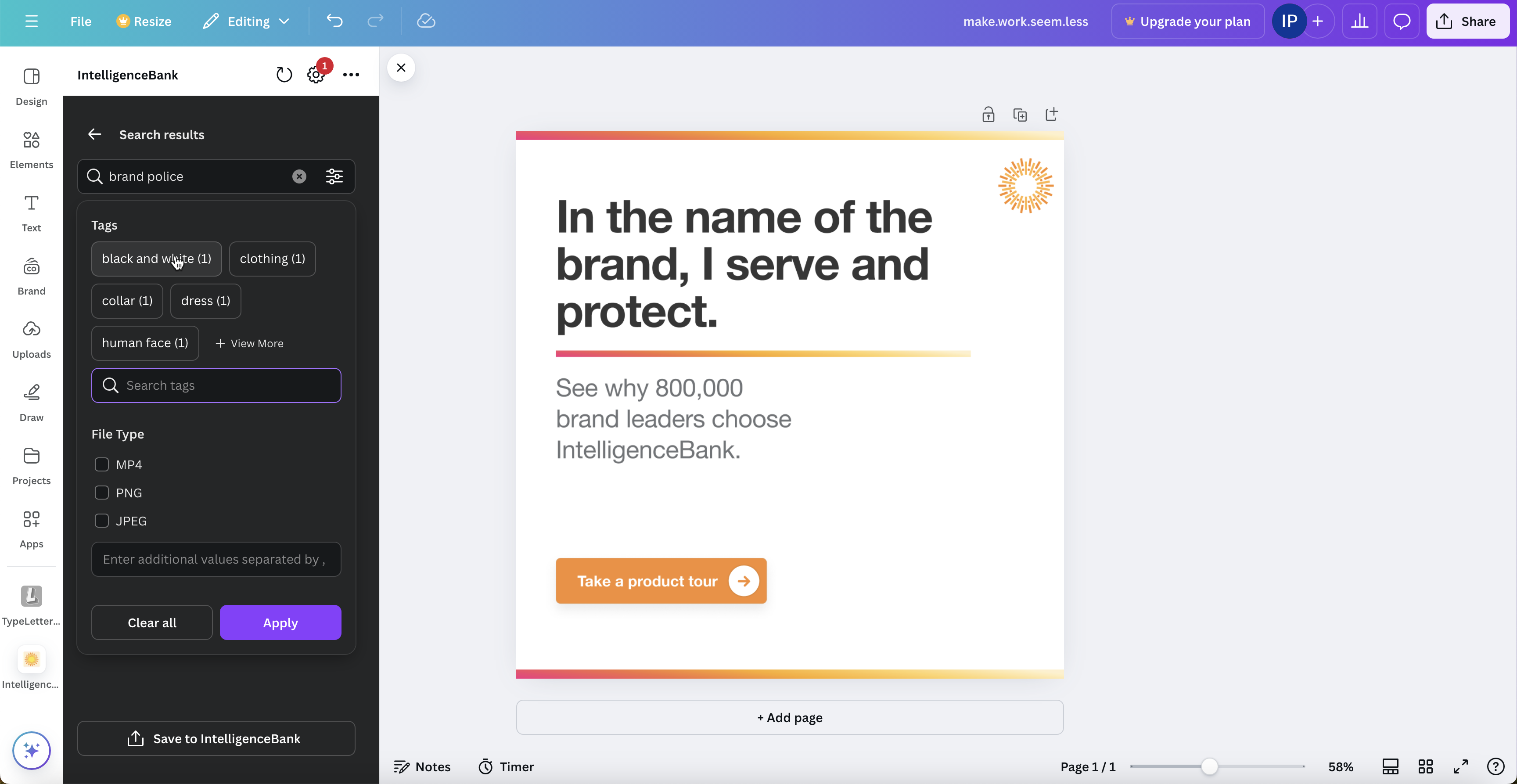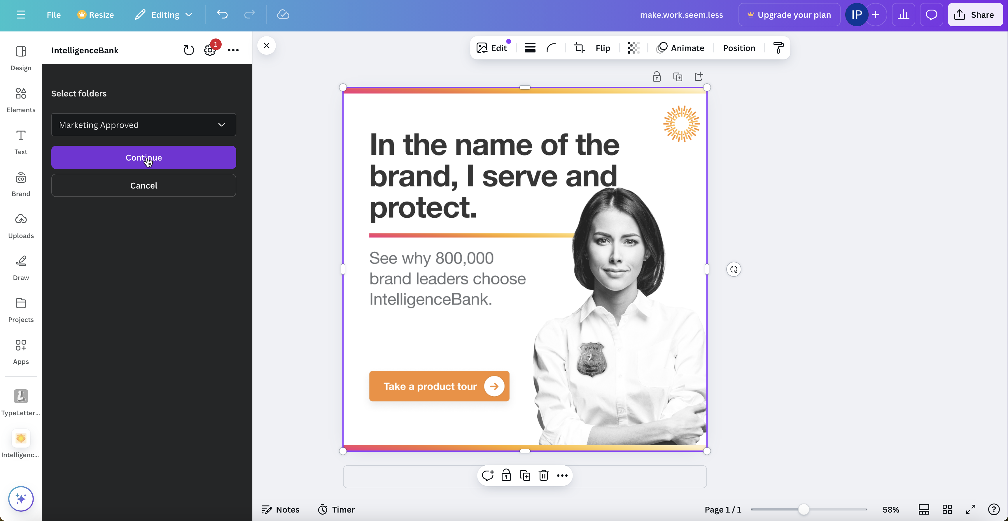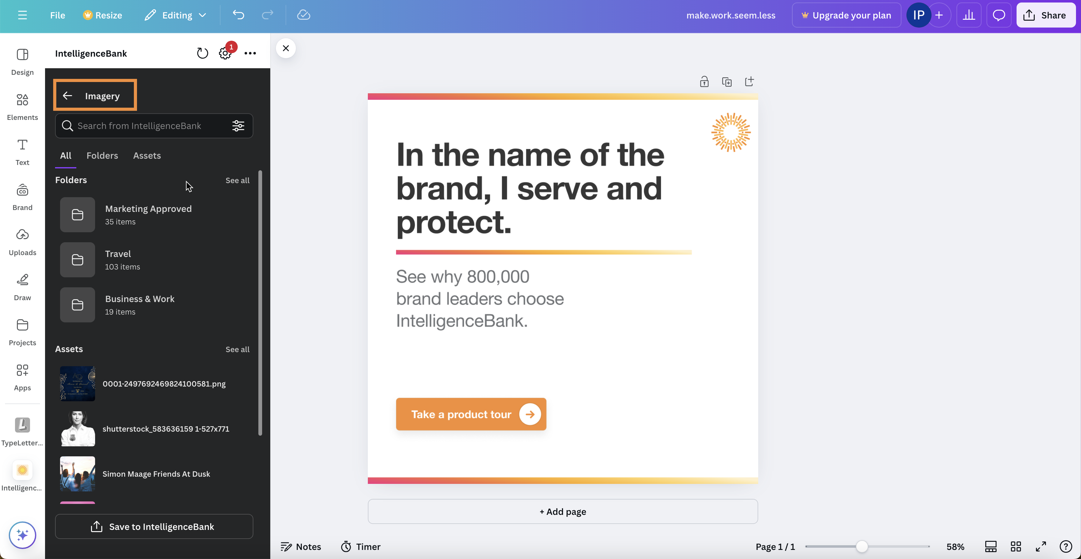 The Intelligencebank Assets Connector (or "app") for Canva makes it easy for designers to search, browse and insert approved image, video or audio assets from IntelligenceBank into their designs, and publish those designs back to IntelligenceBank, directly from within Canva.