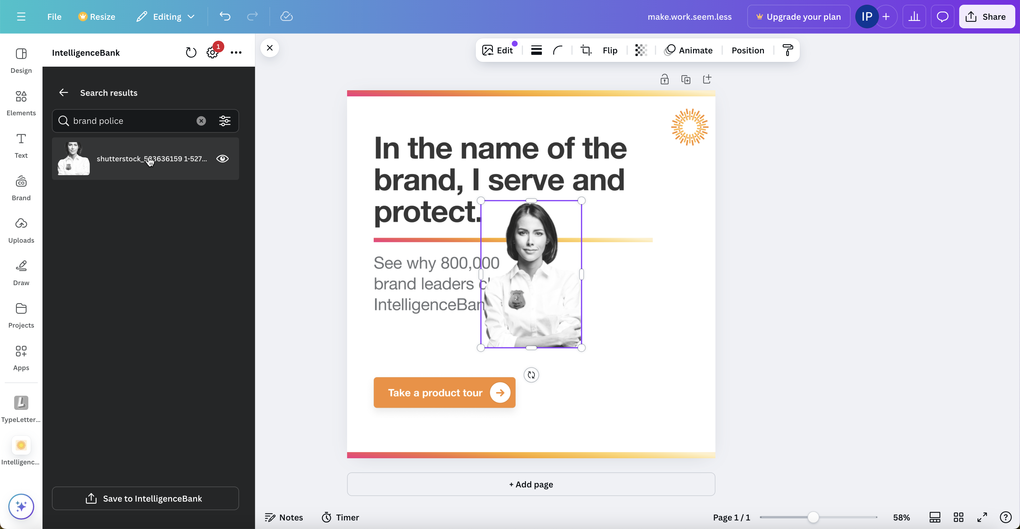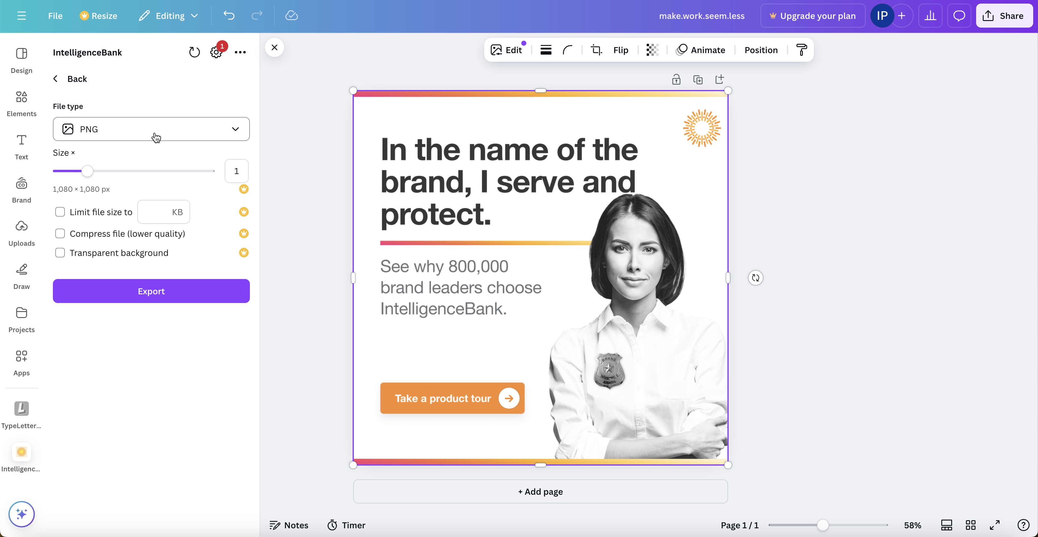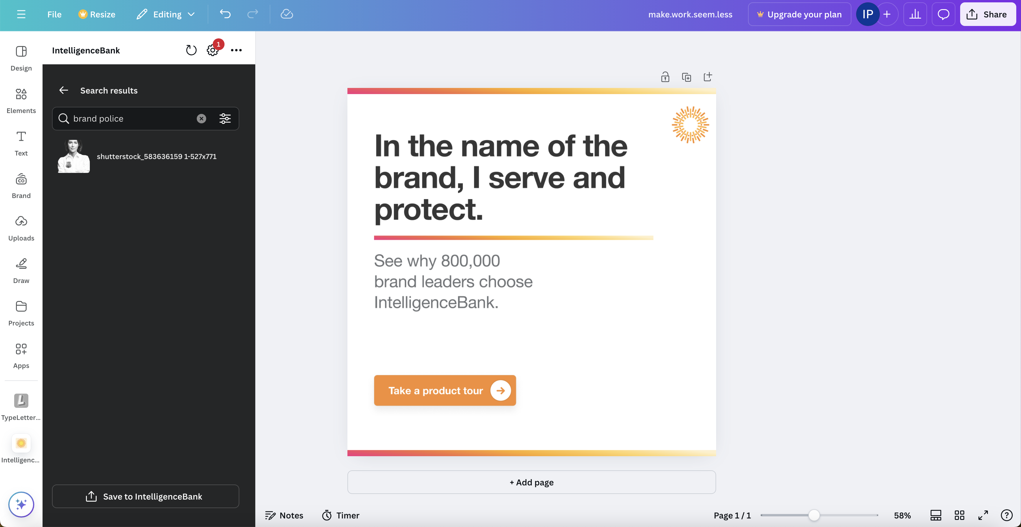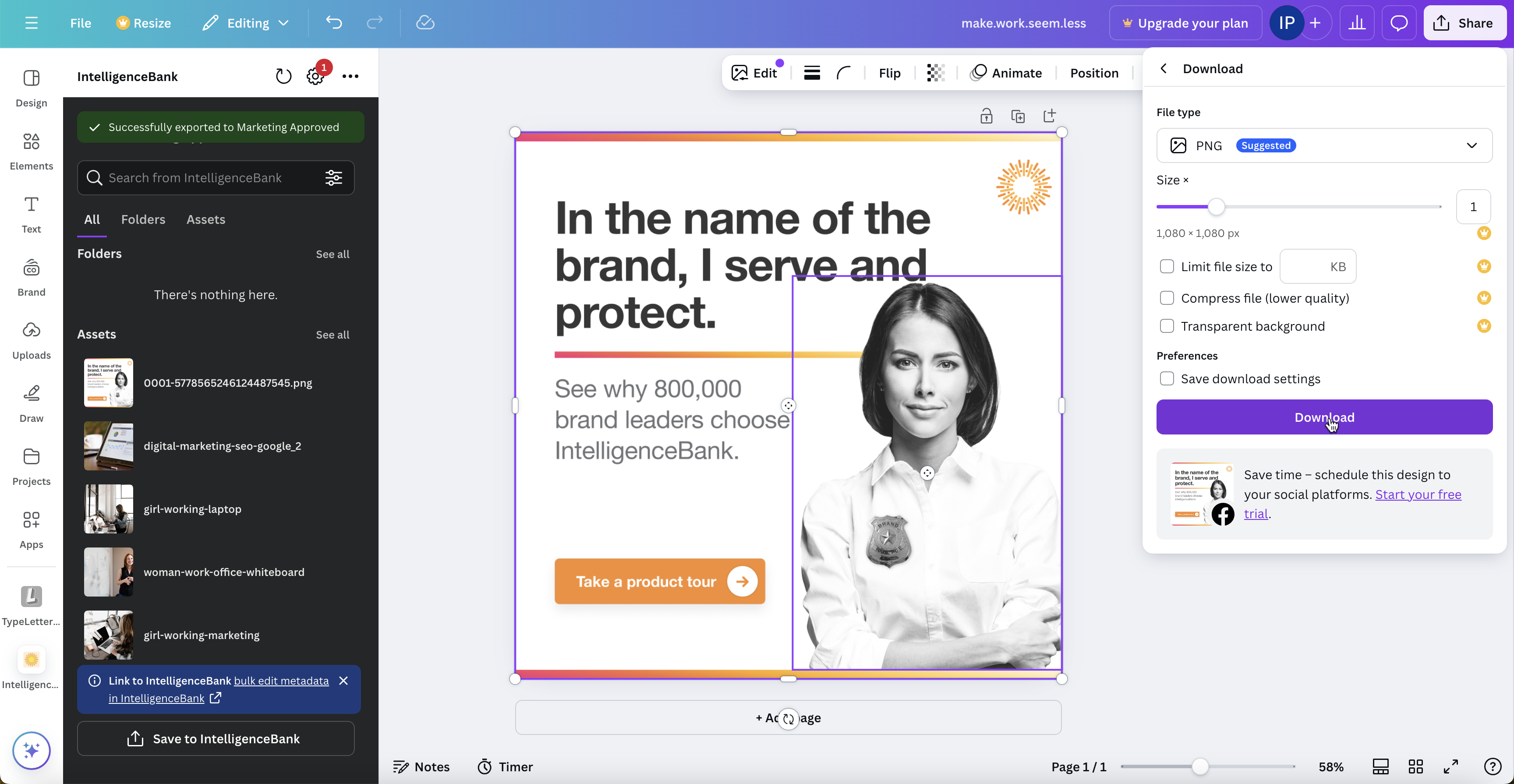 The Intelligencebank Assets Connector (or "app") for Canva makes it easy for designers to search, browse and insert approved image, video or audio assets from IntelligenceBank into their designs, and publish those designs back to IntelligenceBank, directly from within Canva.
