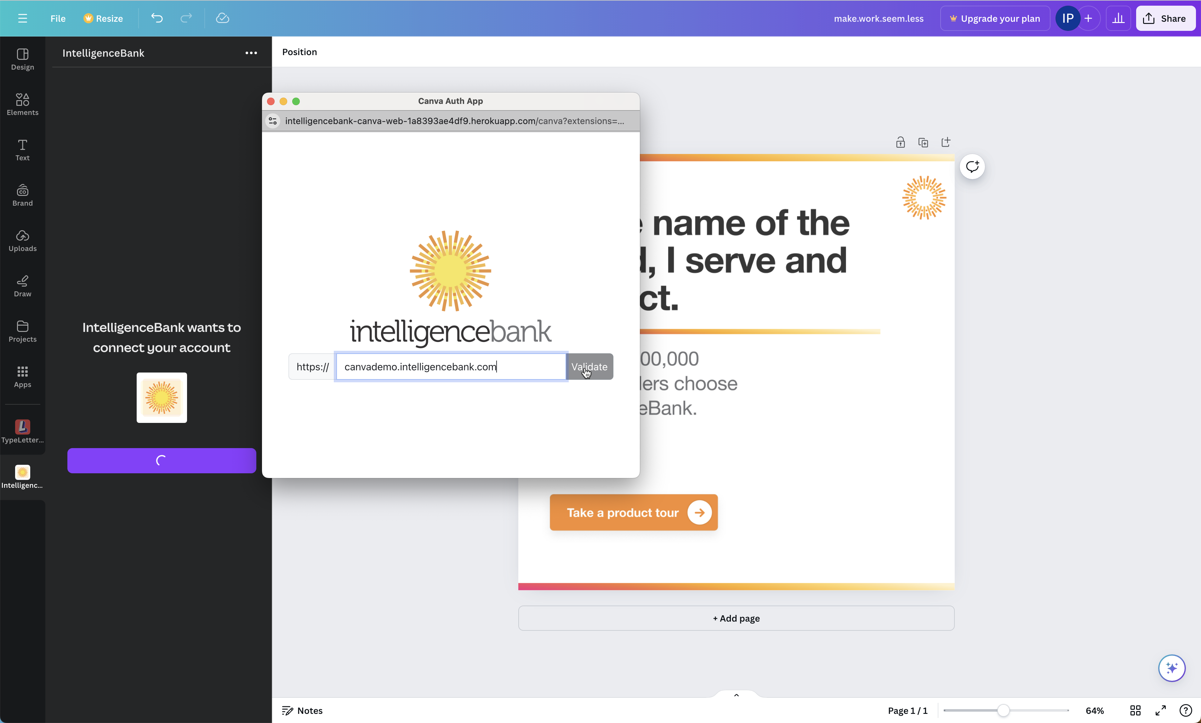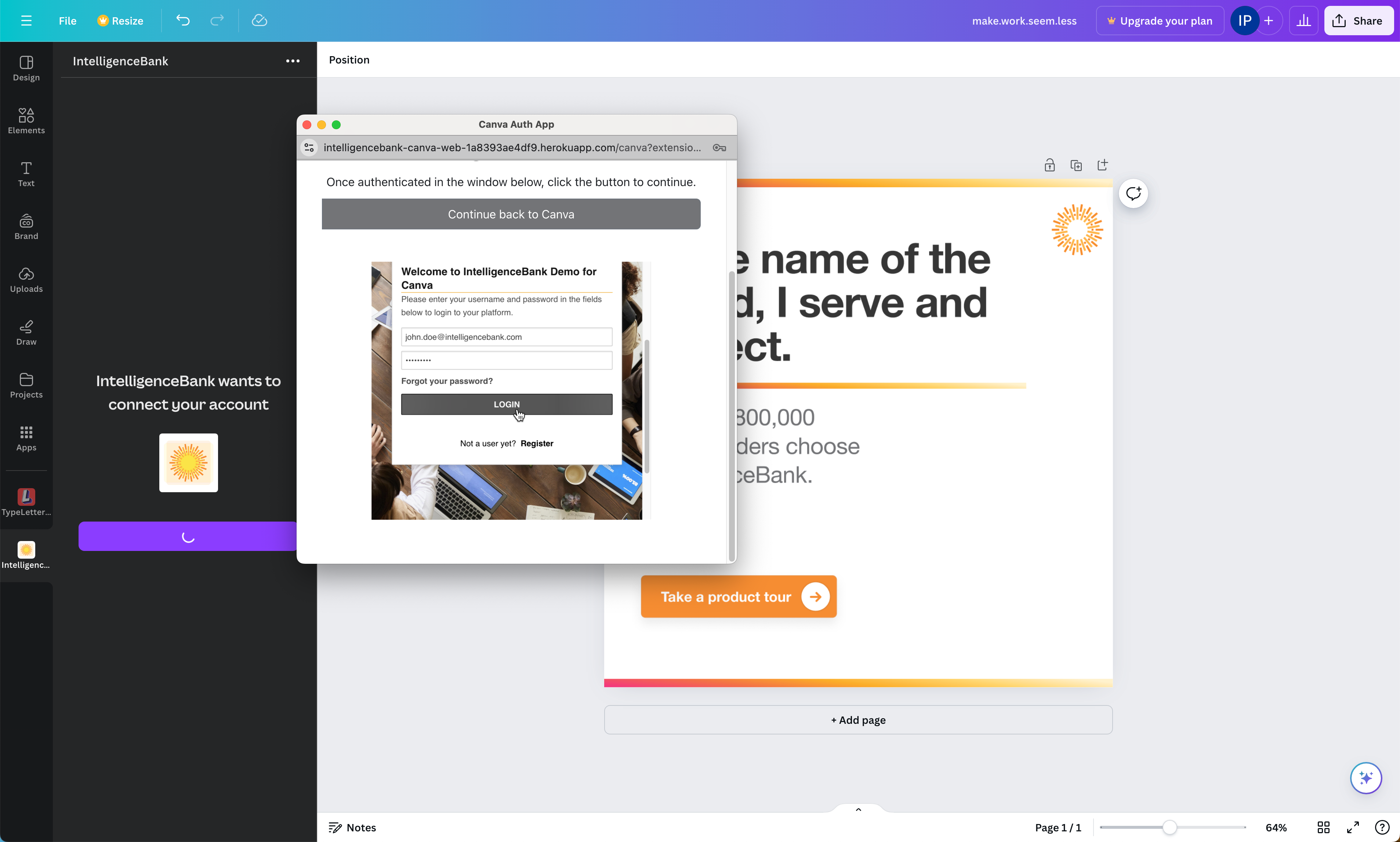 - If the URL entered is valid, your platform login page will load within the popup. If you are already authenticated to your IntelligenceBank platform, you will immediately see a success message as per the screenshot a few steps below. In this case, click on 'Continue back to Canva' to complete the process.