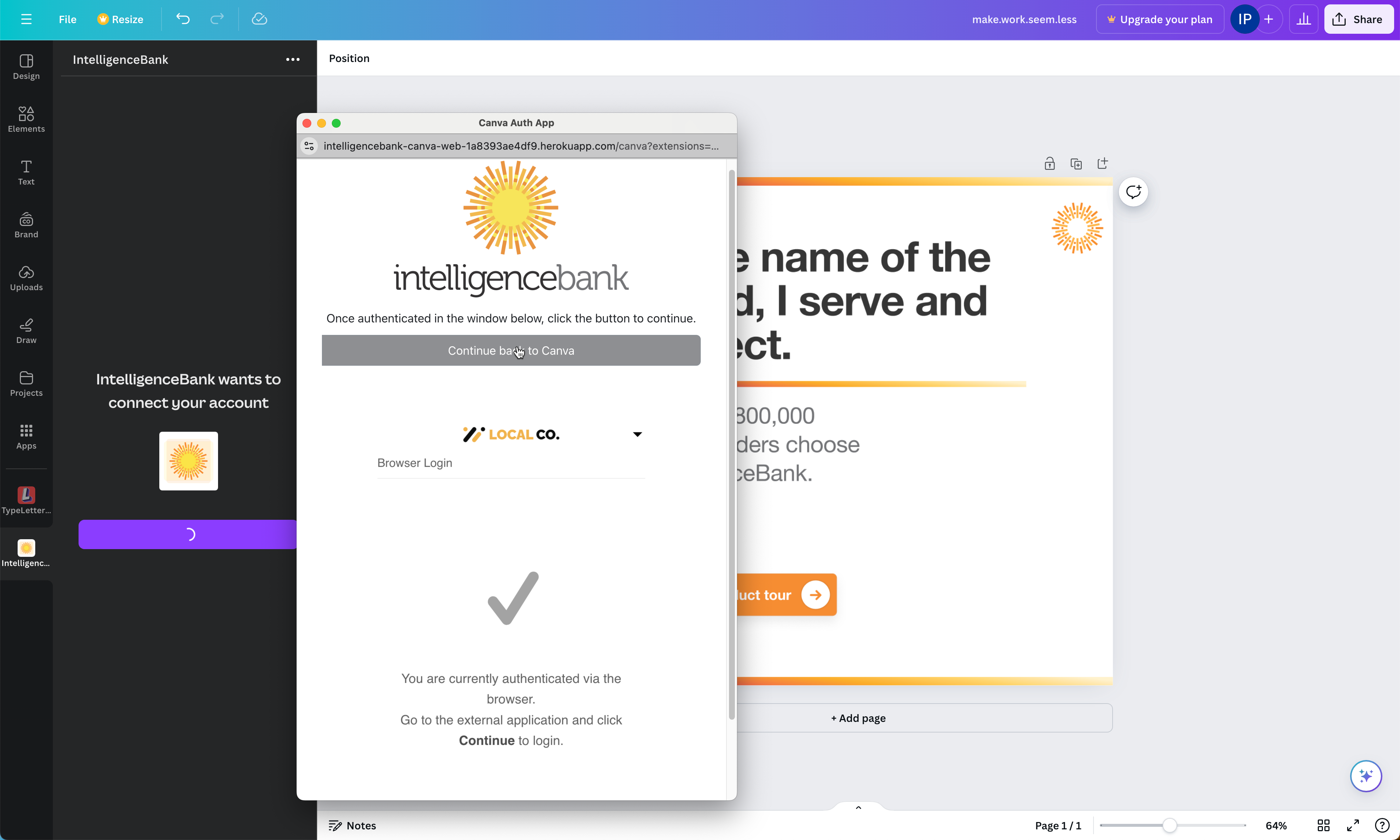 - Once you confirm the External App Authentication and see the message that you are successfully authenticated to IntelligenceBank via the browser, click on 'Continue back to Canva' to complete the process.