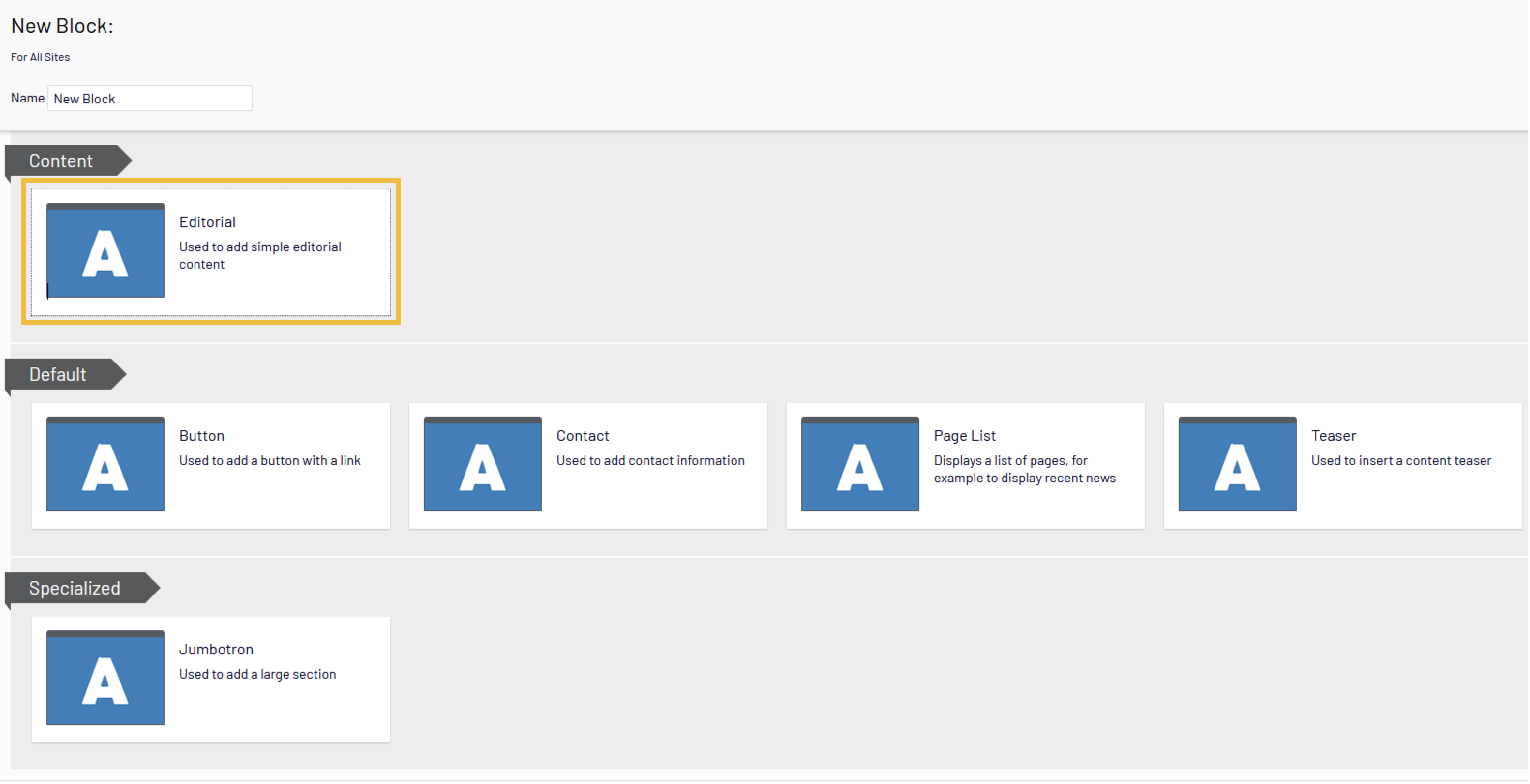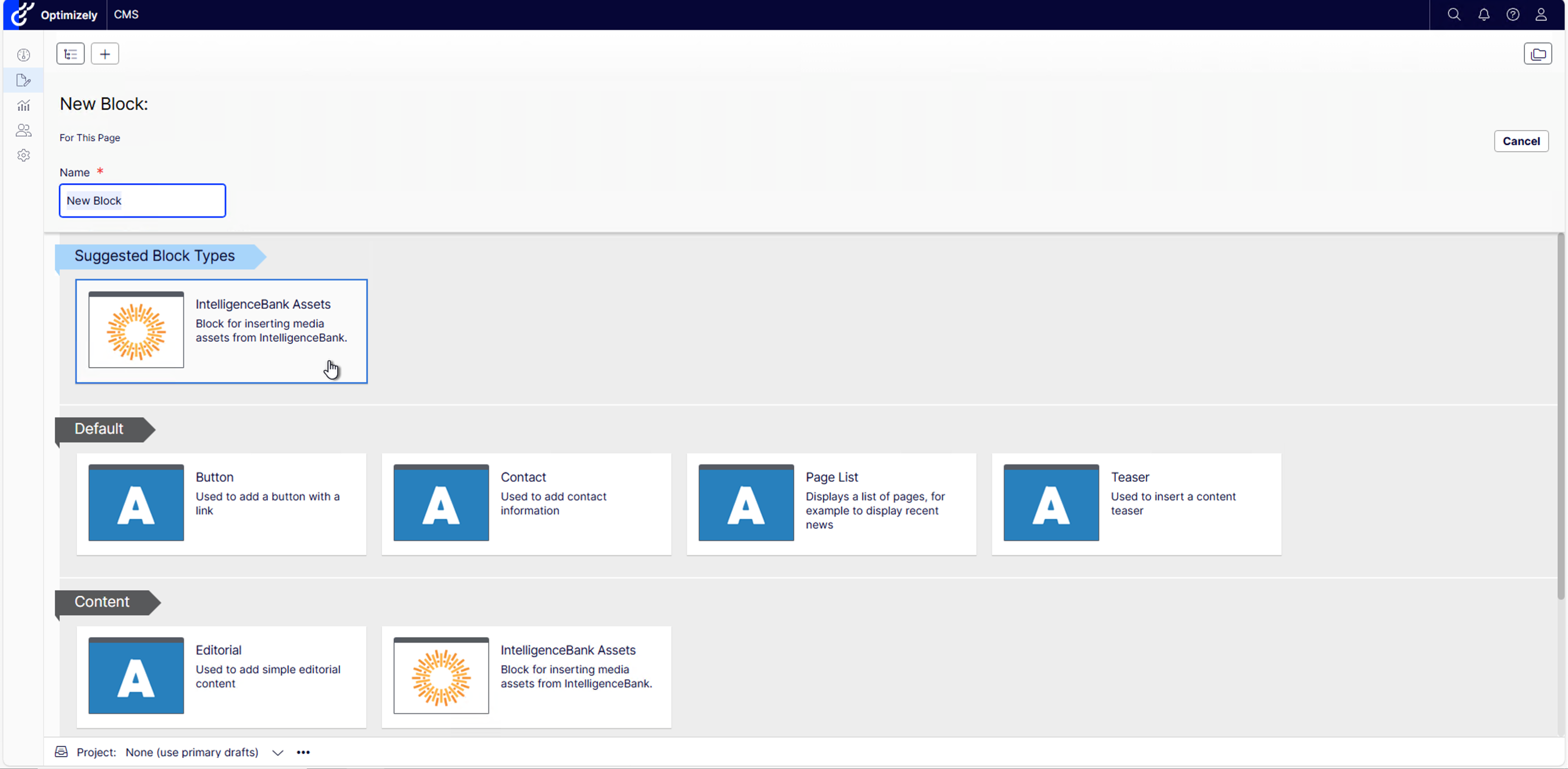 The IntelligenceBank Connector will surface as a new source option of the standard Optimizely CMS 12 Editorial Block. To access the IntelligenceBank Connector, you will therefore need to add an Editorial Block to your page layout. If you already have Editorial Blocks setup, the IntelligenceBank option will now automatically appear there as a new option.