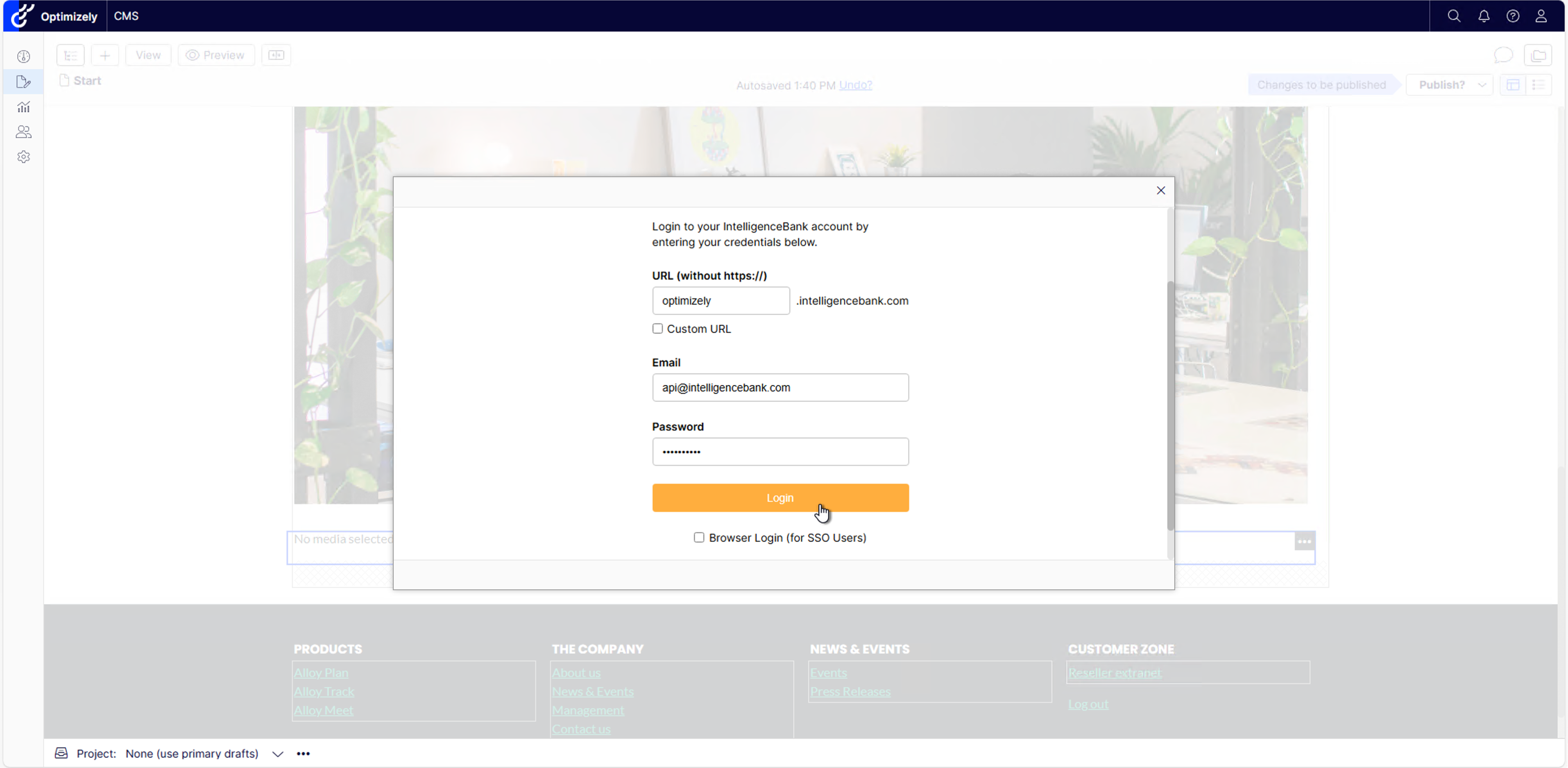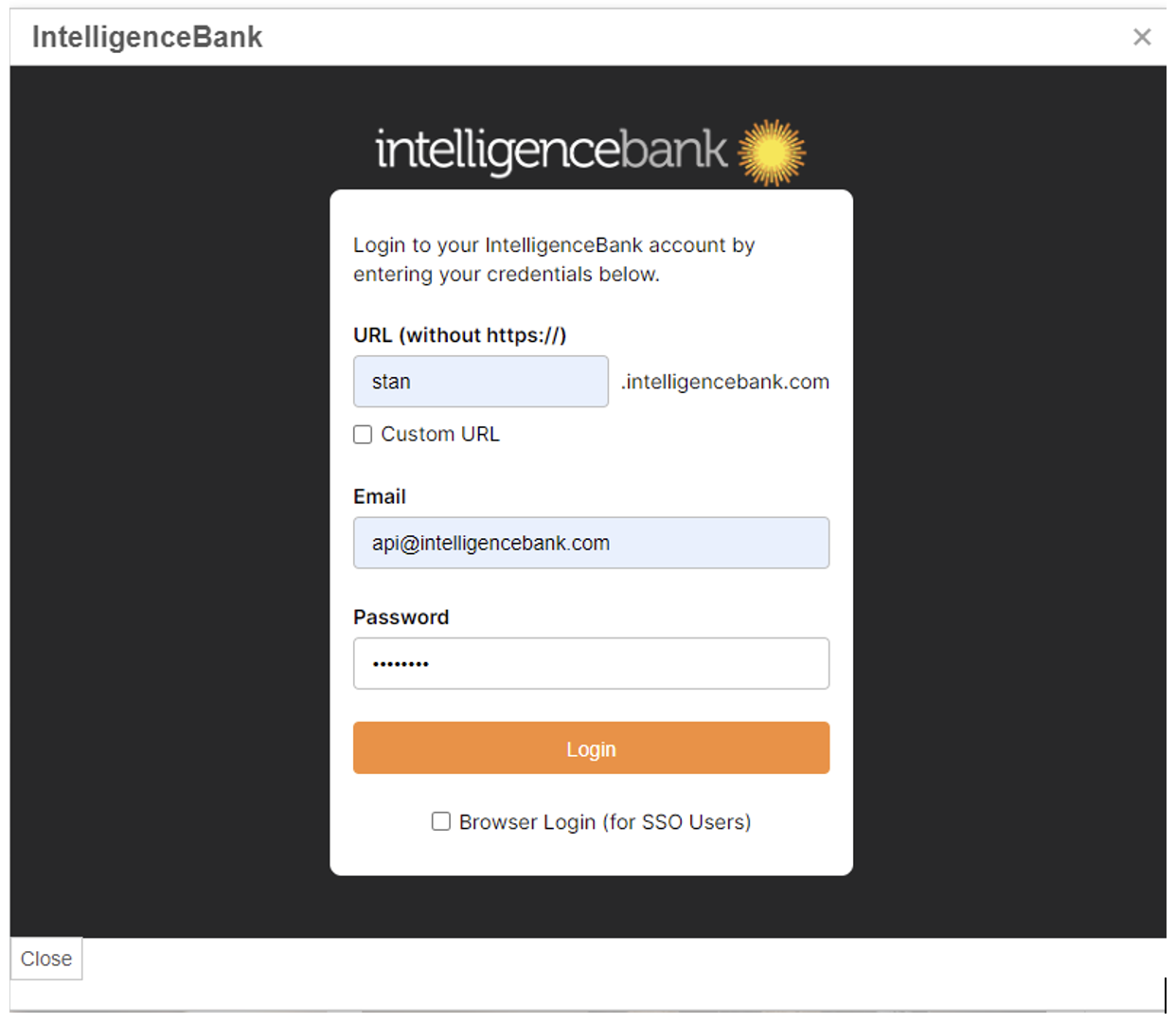 Upon clicking on IntelligenceBank within the Editorial Block, the IntelligenceBank Connector will load as a new window. Login fields will be pre-populated as per the configuration options covered in the previous section of this article. Enter your IntelligenceBank login credentials, or enable the Browser Login to authenticate via Single Sign On.