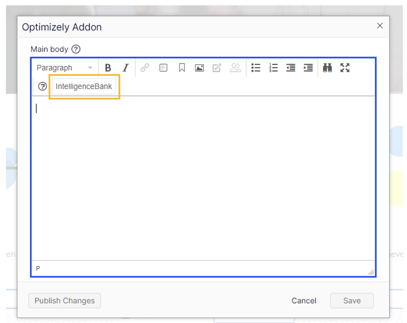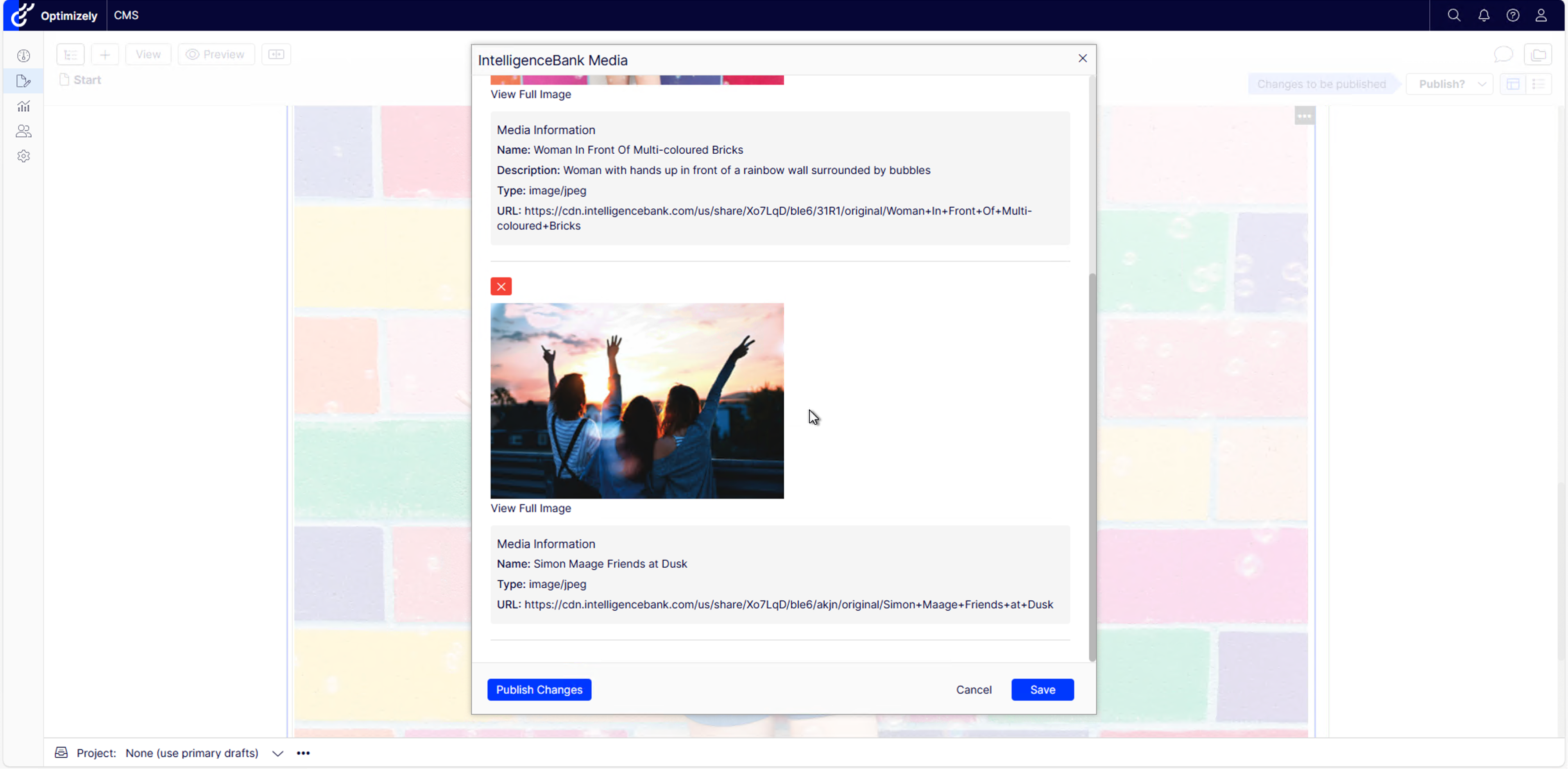- 'https://ucprod.intelligencebank.com/app/?app=optimizely_public' - this will surface the ability to insert your IntelligenceBank platform assets as Public CDN linksfrom the connector. In that instance, assets are not physically copied into your Optimizely instance. Any update to the original asset in IntelligenceBank will get automatically pushed to any location where the Public CDN link is used.