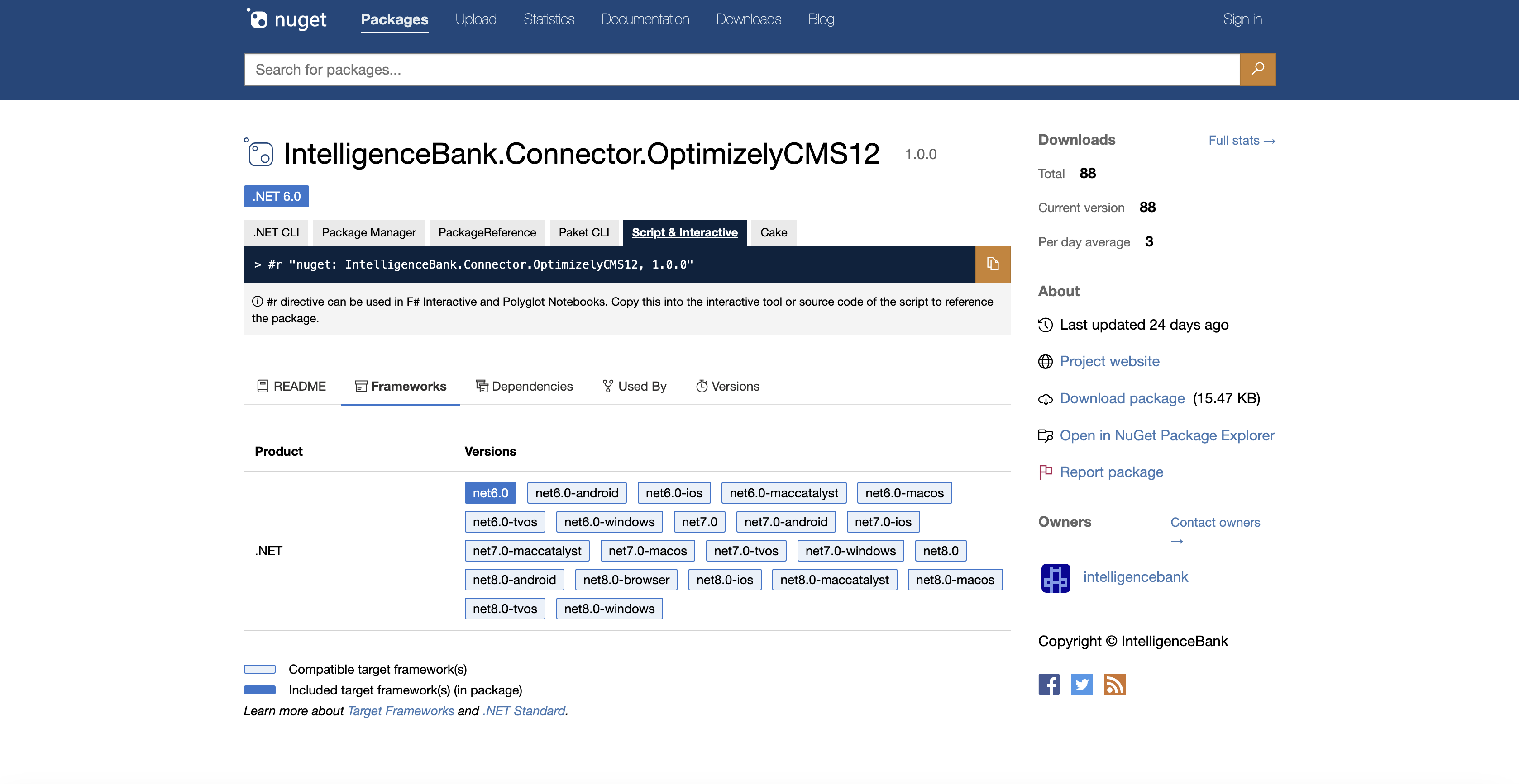 The two versions of the IntelligenceBank Connector for Optimizely CMS 12 documented below are currently compatible with the PaaS version of Optimizely, and with a target framework of .net 8.0. Support for the SaaS version of Optimizely CMS 12 may be implemented in the future.