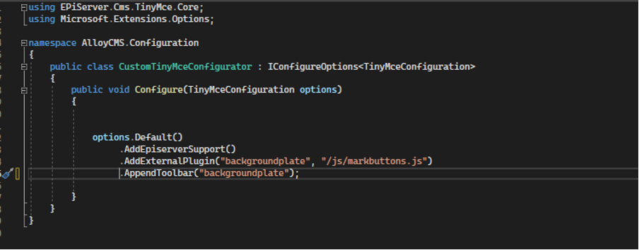 Also add services.ConfigureOptions<CustomTinyMceConfigurator>(); to the ConfigureServices(IServiceCollection services) section.