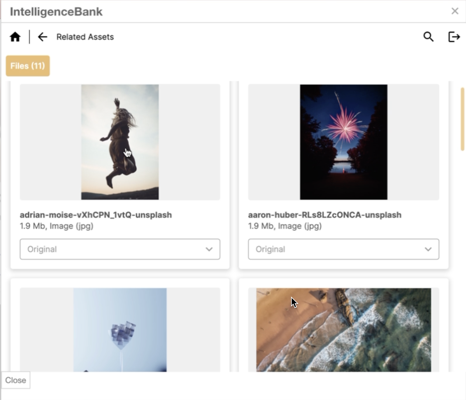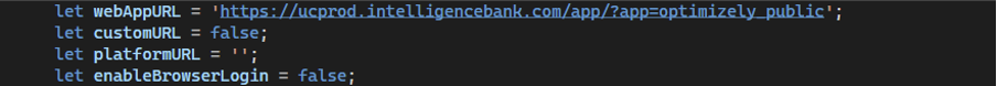 - 'https://ucprod.intelligencebank.com/app/?app=optimizely_no_public' - this will surface the ability to download your IntelligenceBank platform assets from the connector. In that instance, assets are physically copied into your Optimizely assets library, and updates to the original asset in IntelligenceBank are not pushed to any location where the local copy is used.