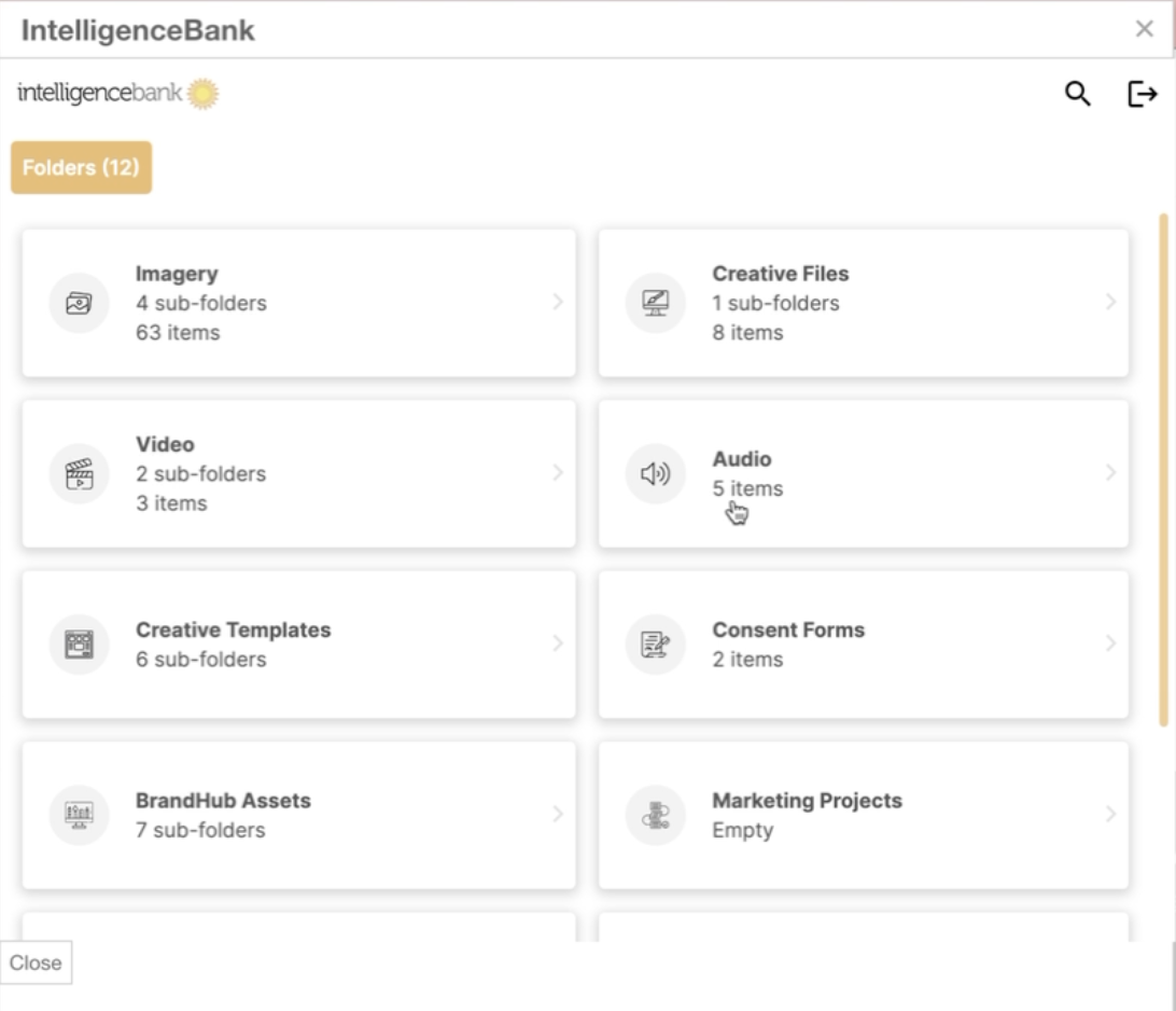 Once authenticated, you will be able to browse Folders, search and find assets, exactly as if you were directly logged in to your IntelligenceBank platform.