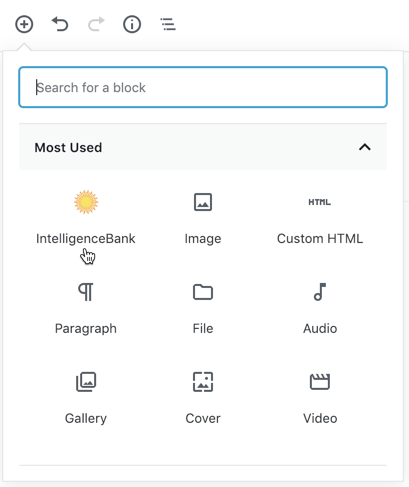 When going to edit a page or a post, you can access your IntelligenceBank platform content via one of the following options:
