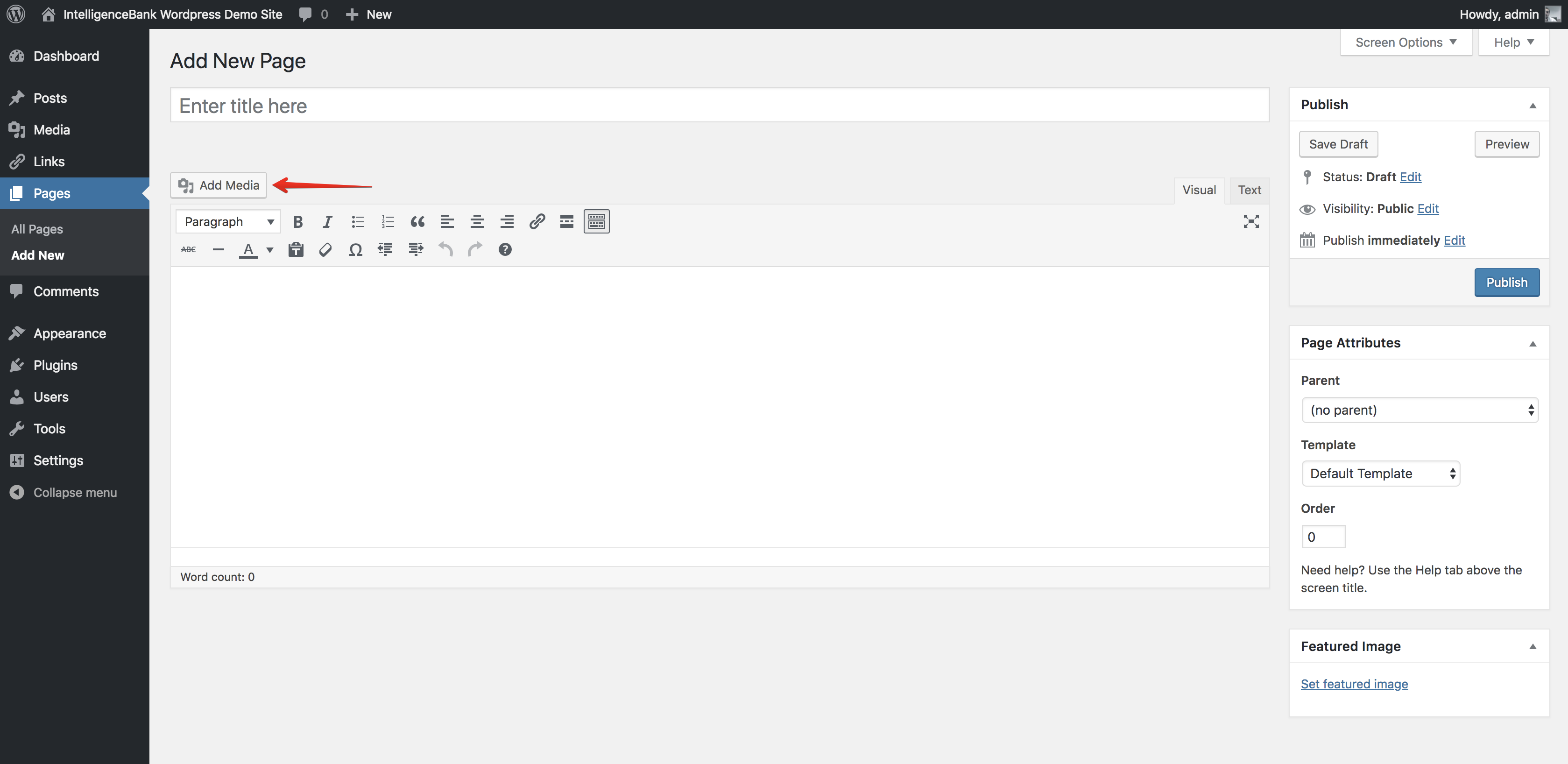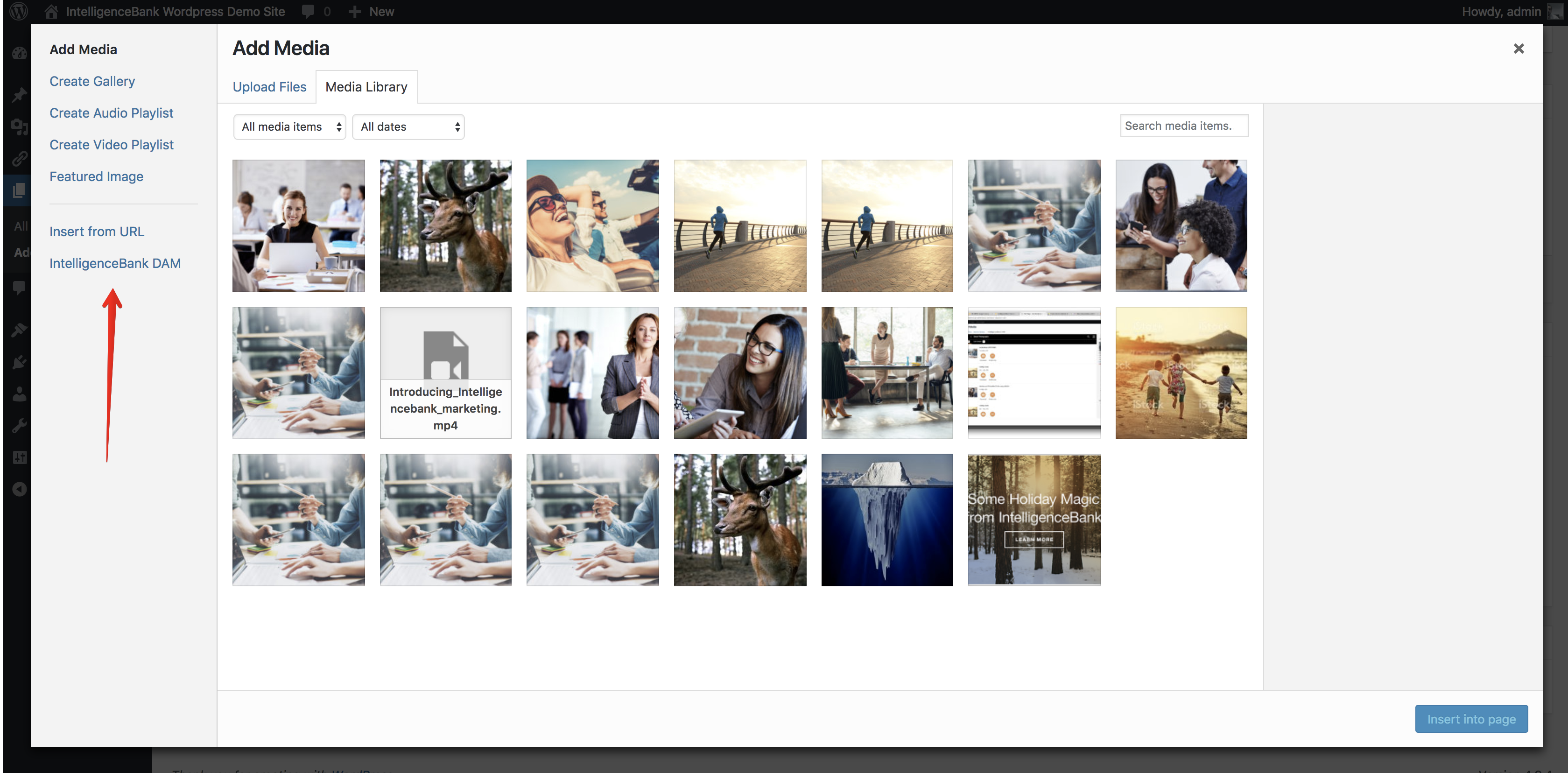When going to edit a page, a post or a product, or to any view in WordPress which has the editor enabled, you can access the IntelligenceBank platform by going into the Add Media view and clicking on IntelligenceBank DAM on the left side menu:
