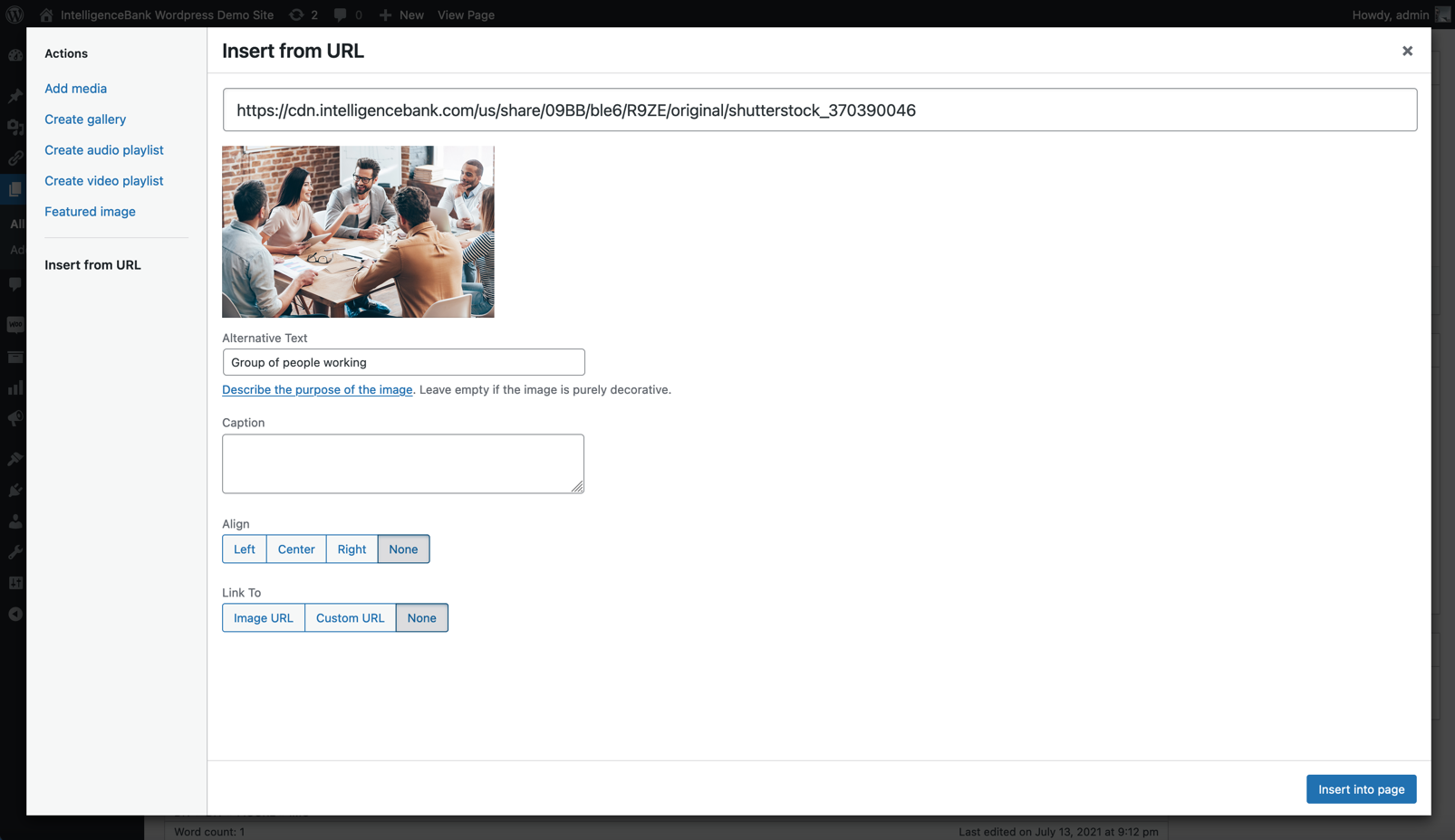 You can also choose to insert or reference a Public Link (if enabled on the parent Folder in IntelligenceBank) to the original asset on your DAM (if enabled). The link will then remained tied to that original asset in IntelligenceBank, so if a new version is uploaded, the file will get updated in your Wordpress content automatically. If the original asset is deleted, it will also no longer load from the Wordpress page where it is used. To prevent inadvertent deletion of active public content, make sure to enable the public links auto check-out feature in your platform. Learn more about how to optimize Image Assets with Public CDN Links in IntelligenceBank CMS Connectors here.