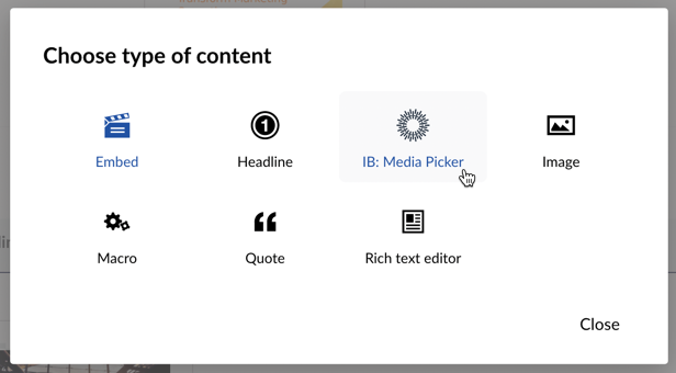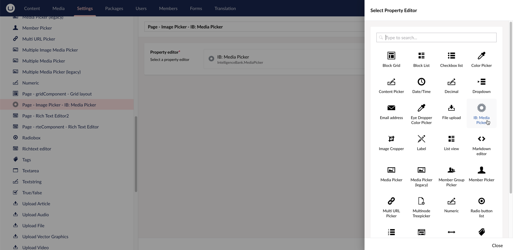 Upon installation, a new property editor called IB: Media Picker will become available for configuration as a data type.