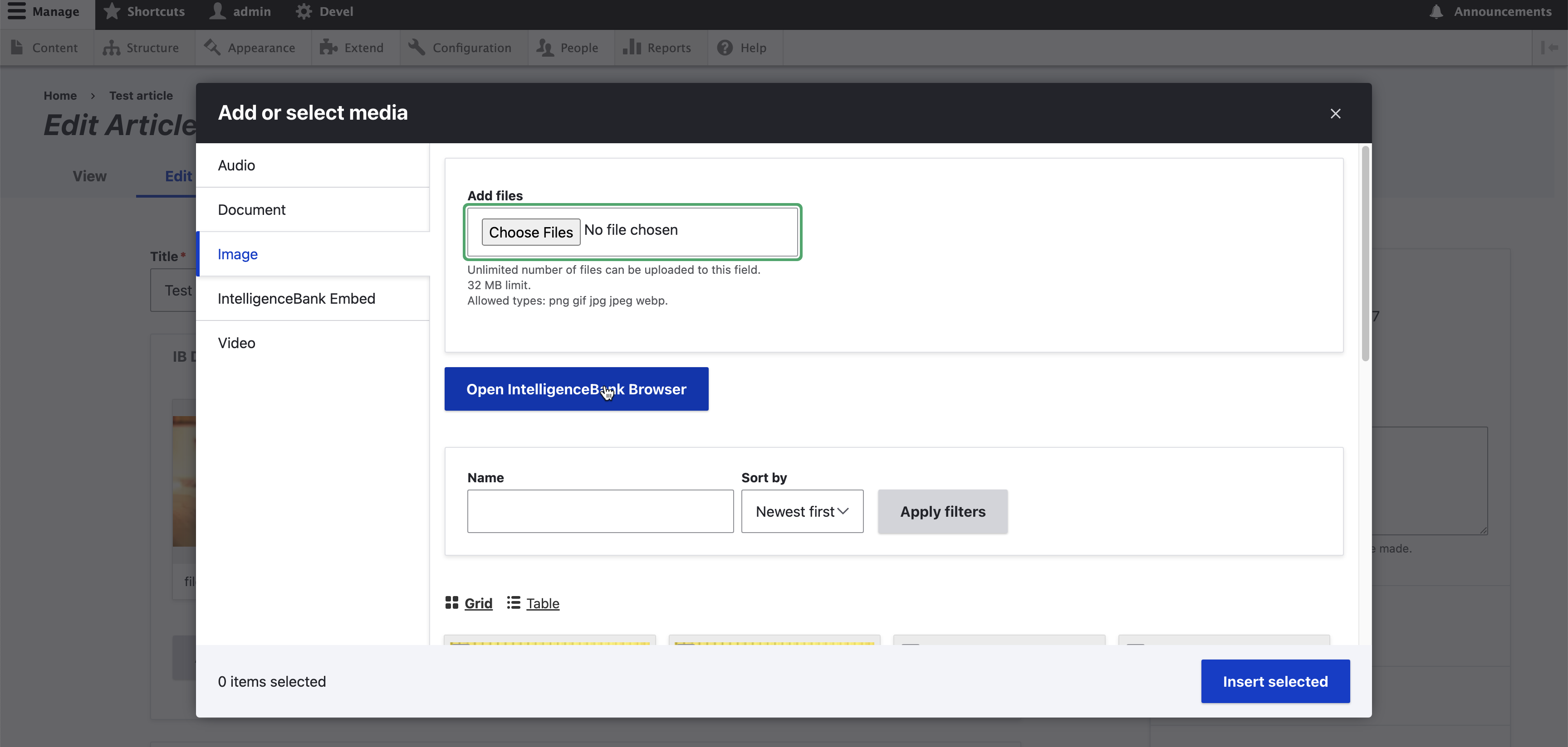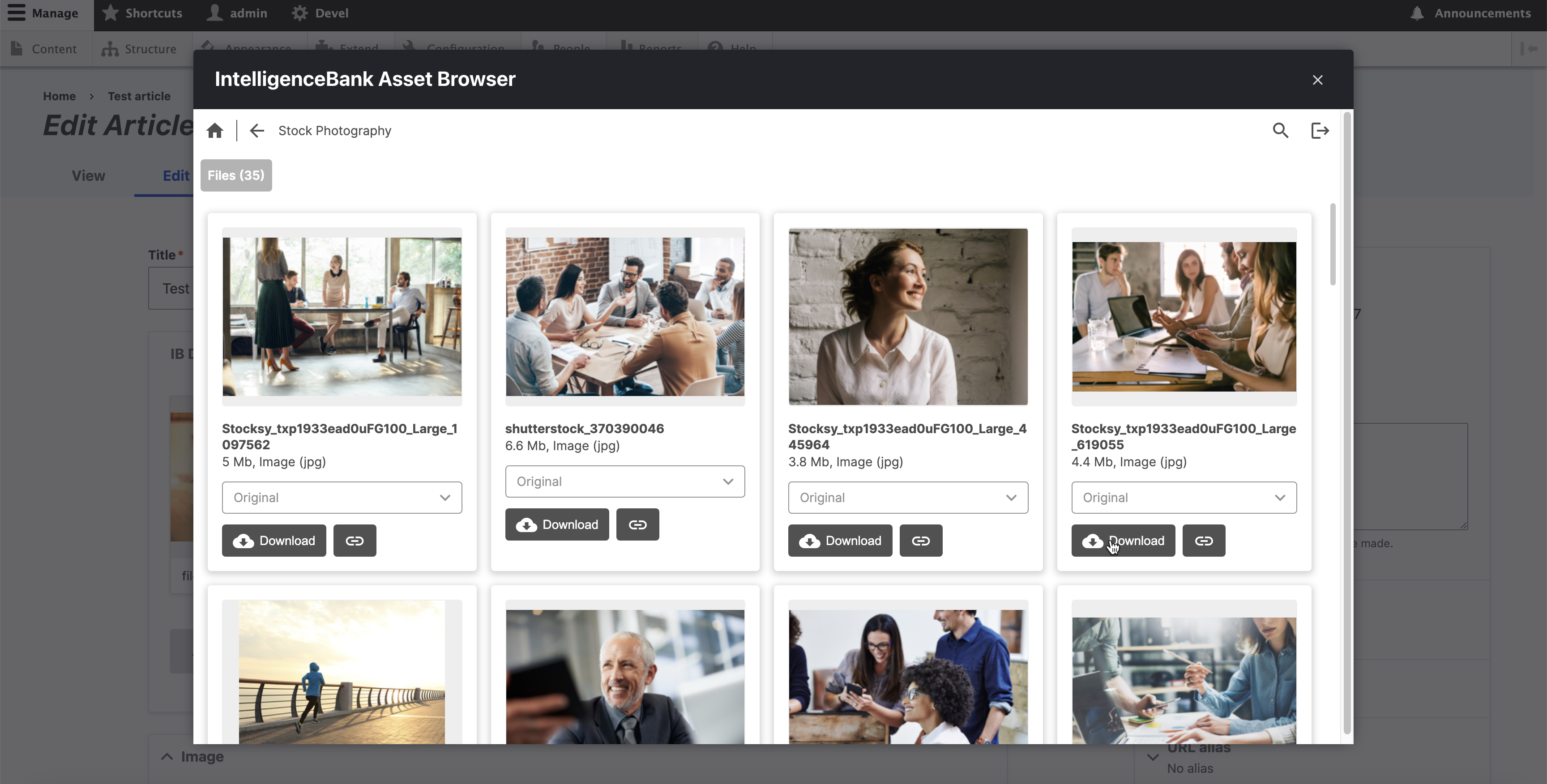 The IntelligenceBank Connector for Drupal provides an easy way to access approved IntelligenceBank DAM assets for importing or embedding, directly from the Drupal core Media Library module.