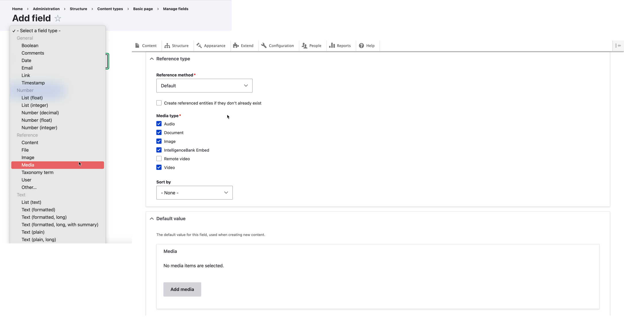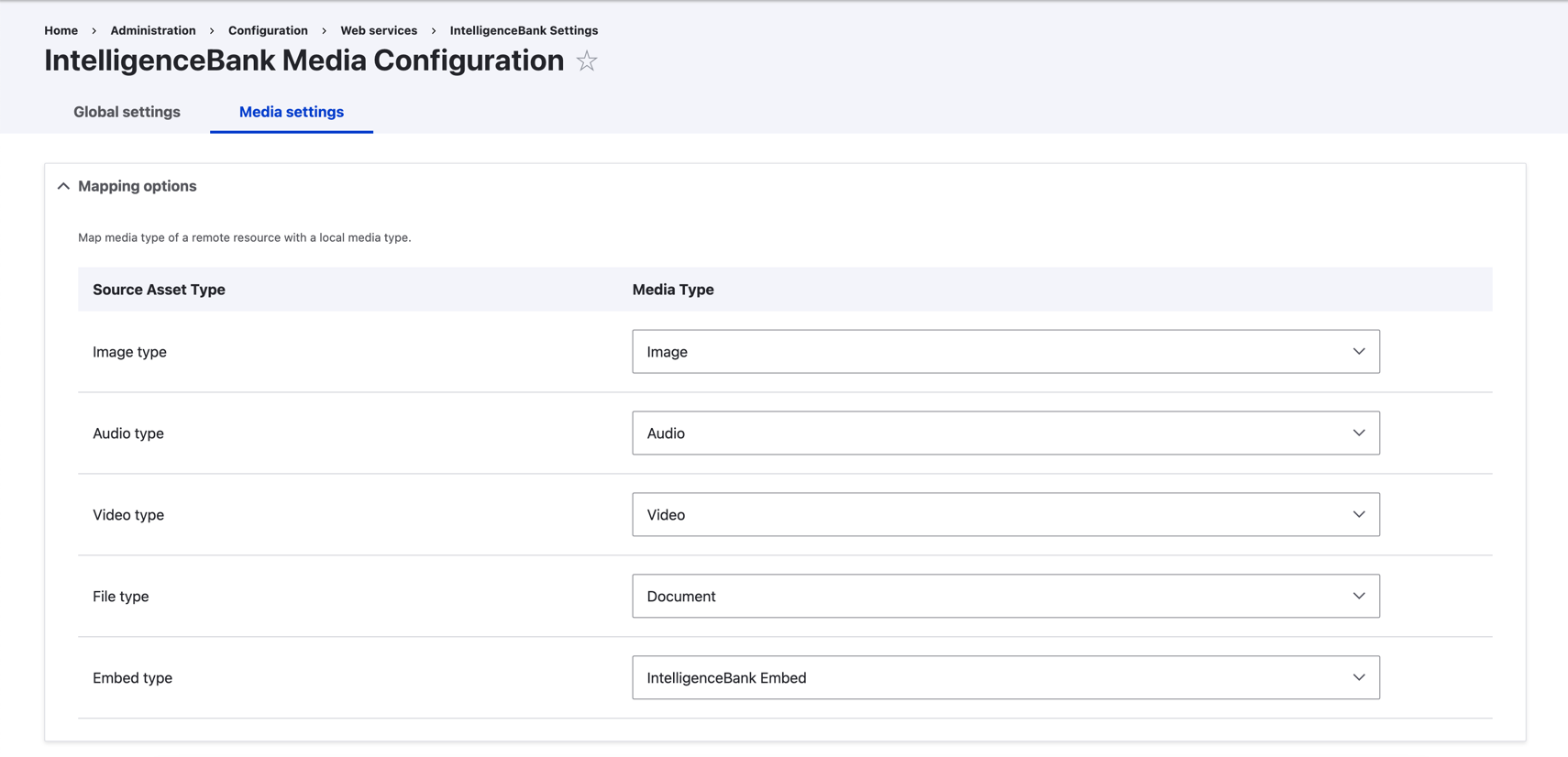Under the Media Settings tab, you will need to map the IntelligenceBank media types to Drupal media types as follows: