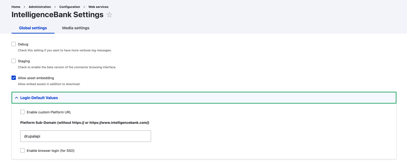 • Allow asset embedding: disable this option if you do not want users to insert Public CDN links to assets hosted in IntelligenceBank. Instead, users will only be able to create local copies within the Drupal media library.