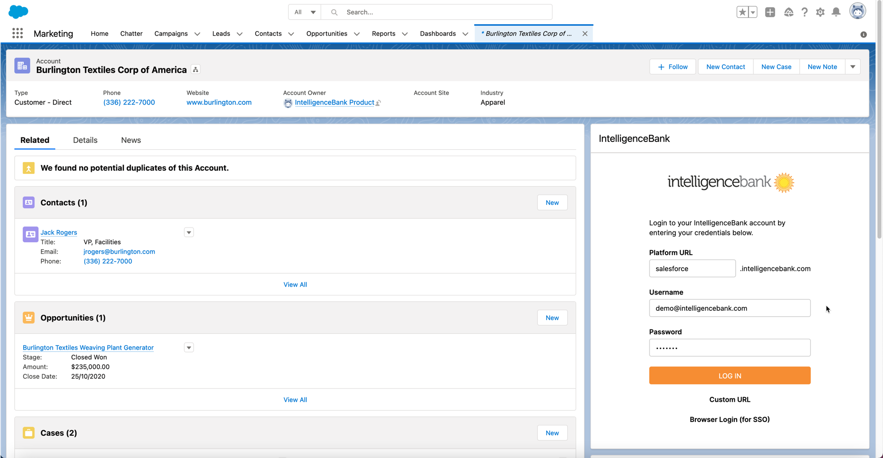 Users can login to their IntelligenceBank platform directly from within Salesforce.