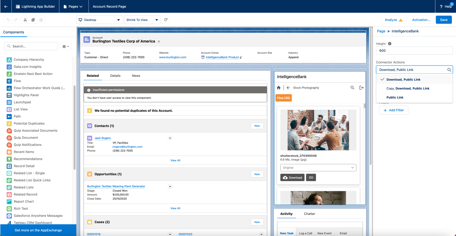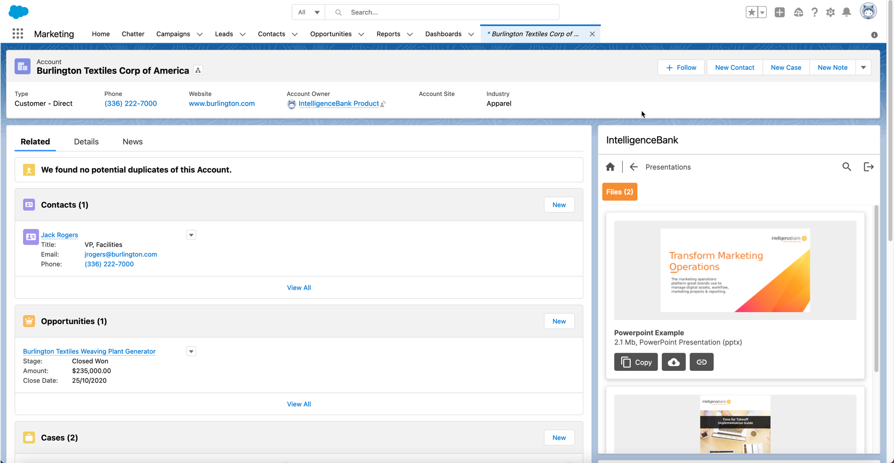 The IntelligenceBank Assets Connector for Salesforce Sales Cloud is a Lightning Component that makes it easy for users to access their IntelligenceBank content directly from within Salesforce.