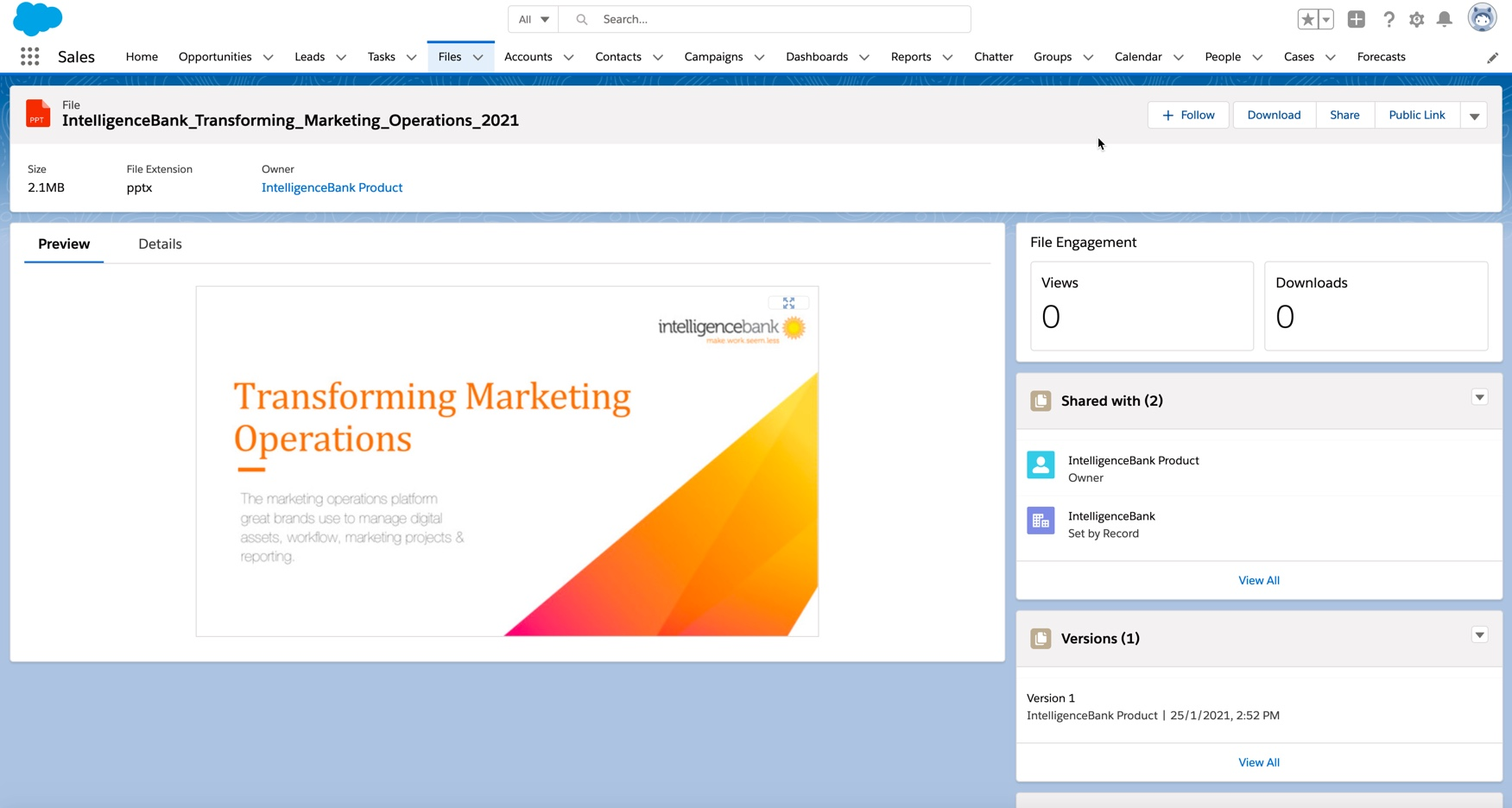 In IntelligenceBank, the usage reporting displays when files have been accessed from Salesforce.