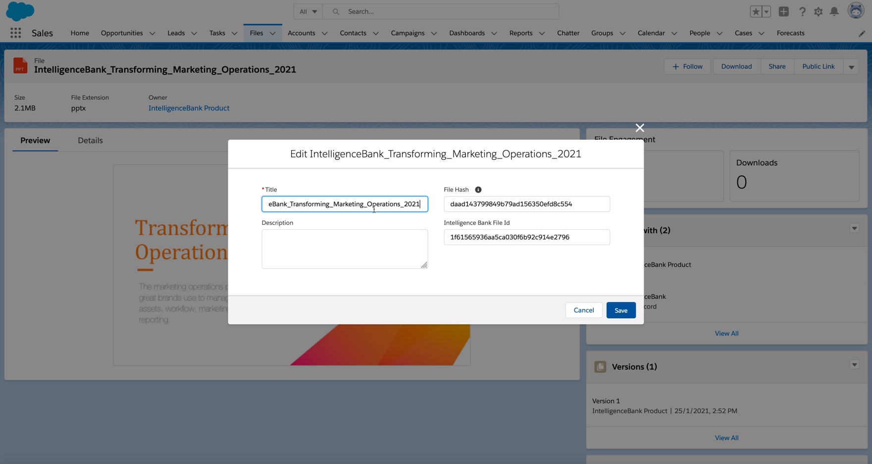 Follow the steps outlined here to install the IntelligenceBank Assets Connector for Salesforce Sales Cloud.