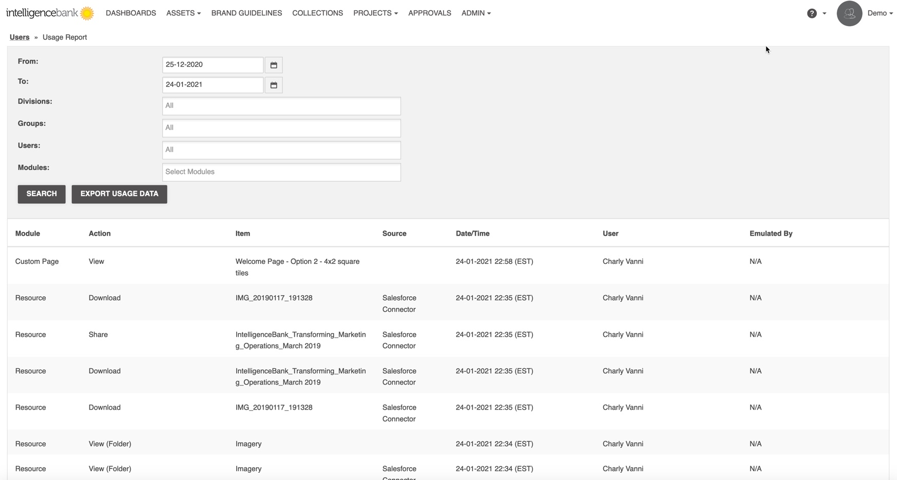 All actions conducted by users within the IntelligenceBank Assets Connector for Salesforce will appear in the usage reporting within IntelligenceBank, enabling Admin users to track and report on which files are being used within Salesforce.