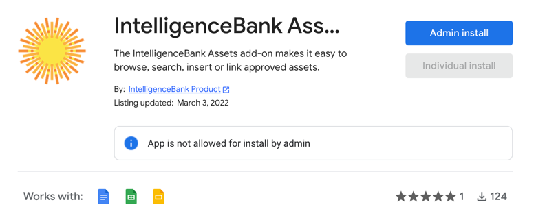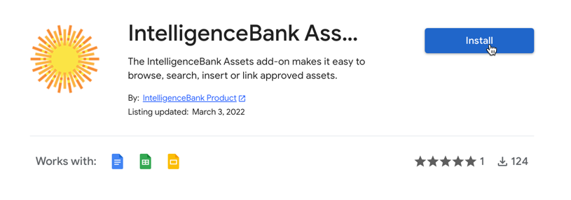 You can install the Intelligencebank Assets Add-on plugin for Google Workspace from the Google Workspace marketplace.