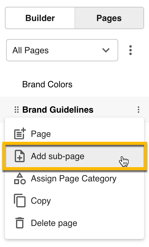 When hovering over a Page, select the More icon (3 dots) to access a dropdown menu and click Page (highlighted below).