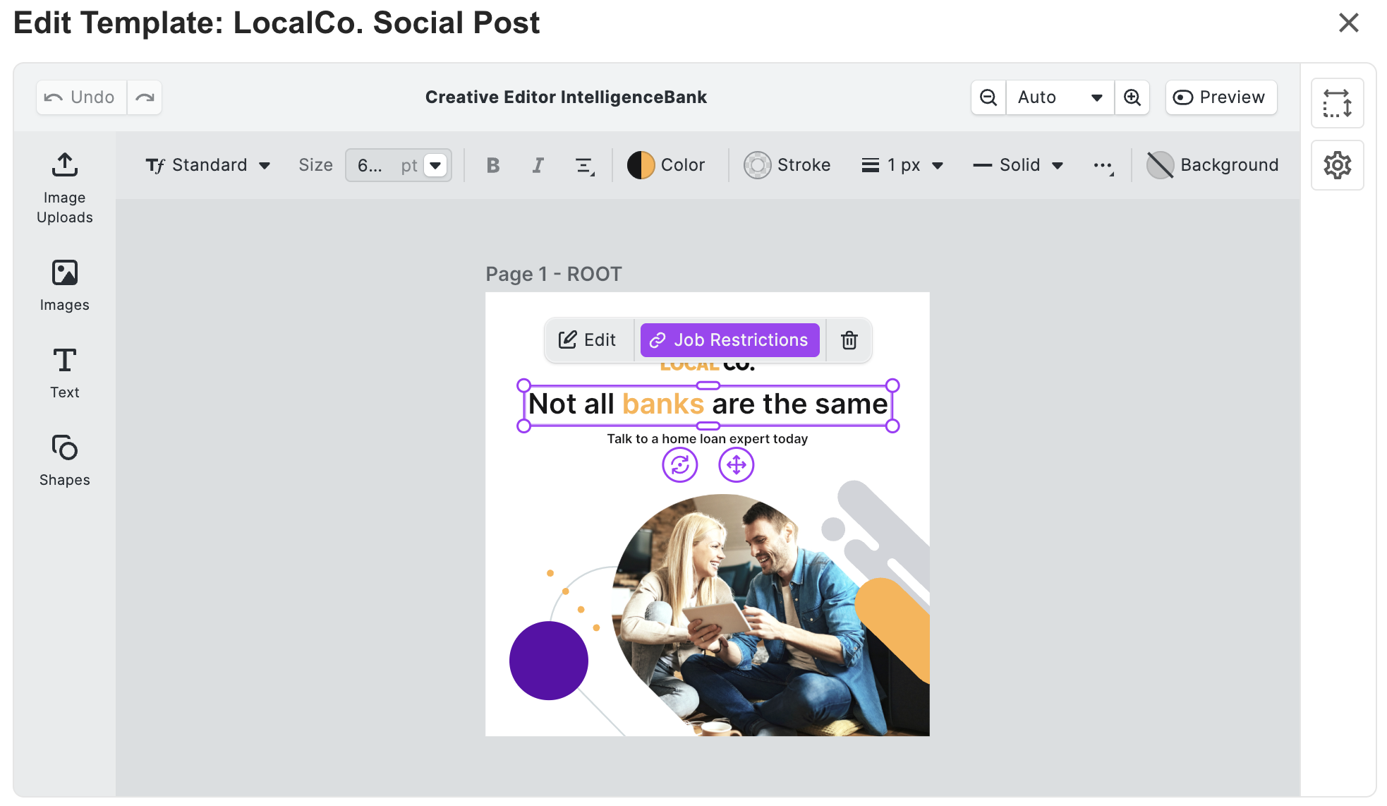 The embedded template builder allows users to create new design templates directly within their IntelligenceBank platform. It also supports one-to-many functionality, allowing template creators to design multiple alternative sizes for any given template. This makes it easy for Job Creators to enter their information once and have it apply to all the sizes they need.