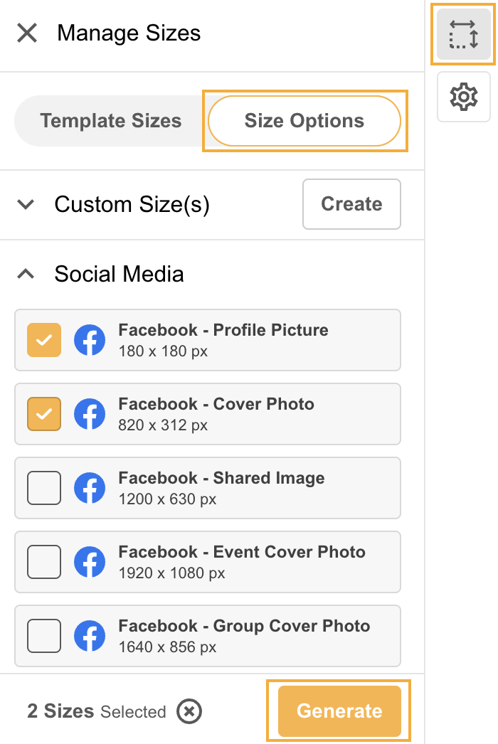 This layout will be used to create all additional sizes. Changes made to this size will be applied to all other sizes when saved.