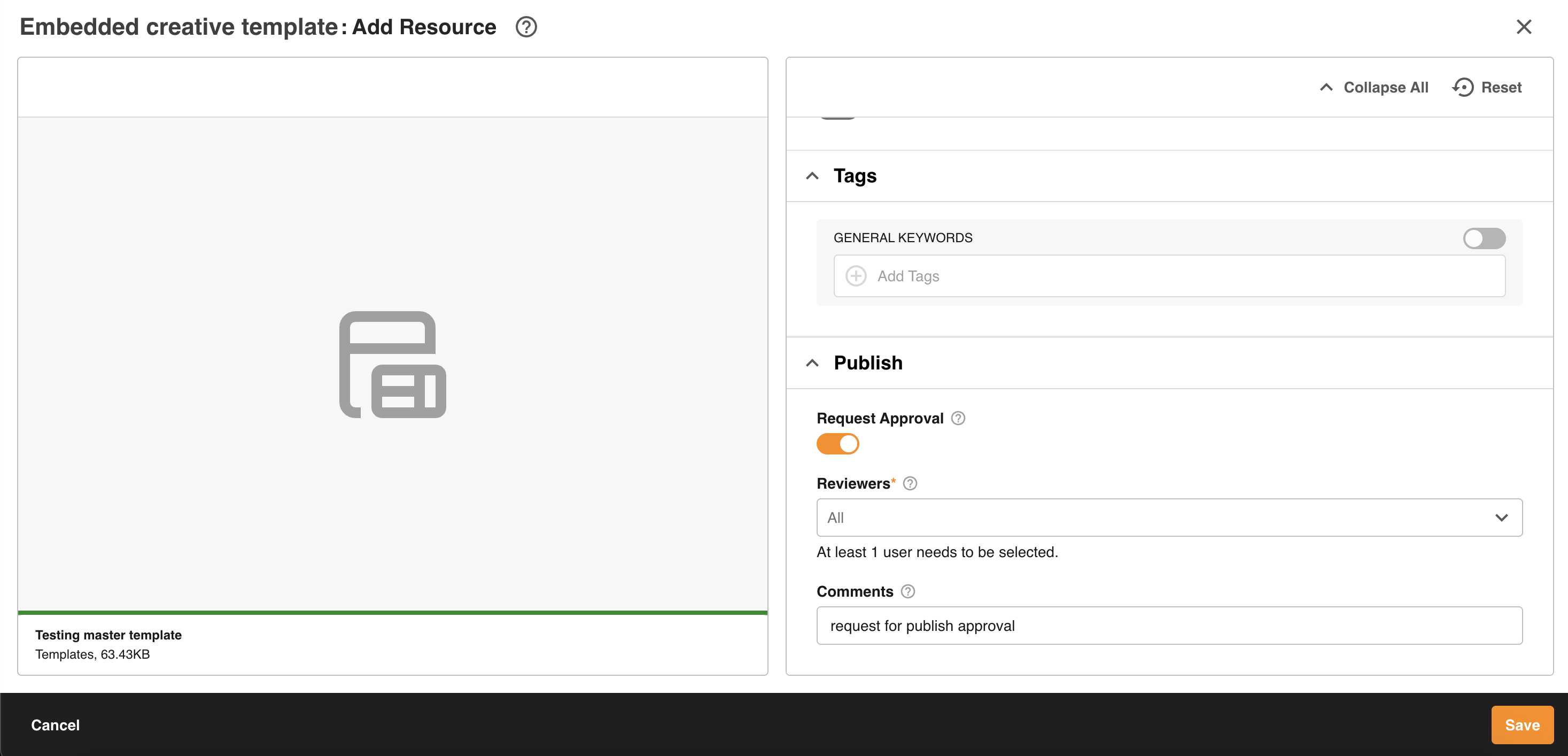 - Confirm the Resource Name, apply any additional metadata, filter, or keywords, and ensure the request approval toggle is ON.