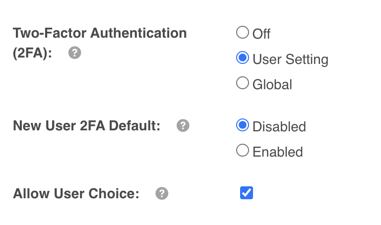 If User Setting is selected, two additional fields will populate- "New User 2FA Default" and "Allow User Choice".