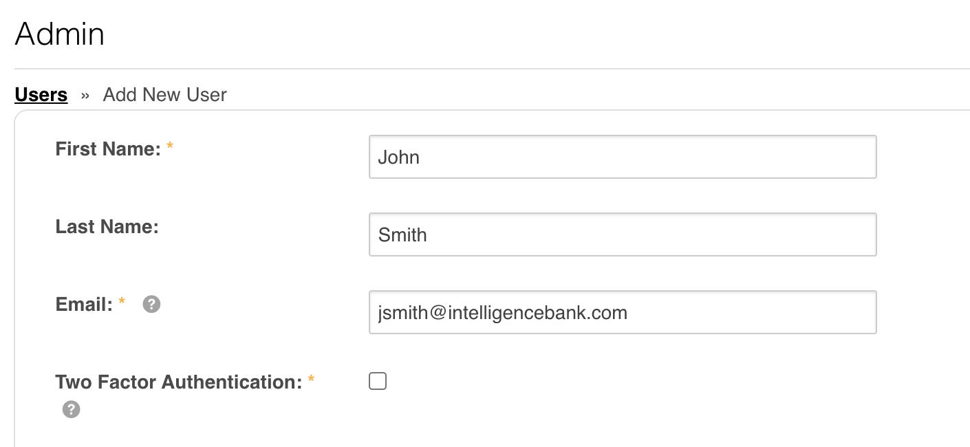 Selecting "Disabled" means that when Admins add new users in the platform, Two- Factor Authentication will not automatically be enabled when creating the new user's profile, though it can still be enabled by manually selecting the "Two Factor Authentication" checkbox as it appears in the example below. This might be the preferred setting if only a small subset of users within your platform will need 2FA enabled.