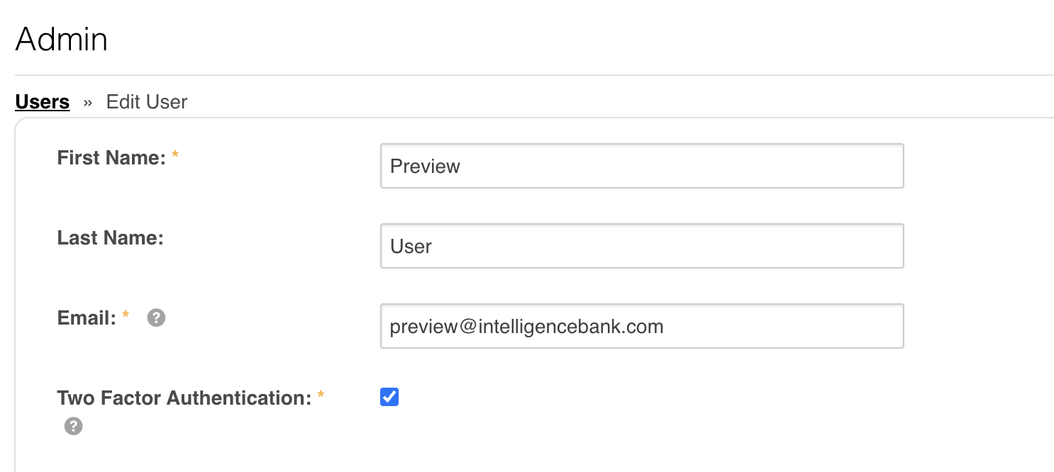 If the "Two-Factor Authentication (2FA)" is "User Setting" and the "2FA Type" is "Email," then Main Admins will be able to enable 2FA on existing users by going to their Admin>Users area of the platform, selecting an existing user, and selecting the "Two Factor Authentication" checkbox that appears (see example below). Once the user profile is saved, that user will then be required to login with 2FA.