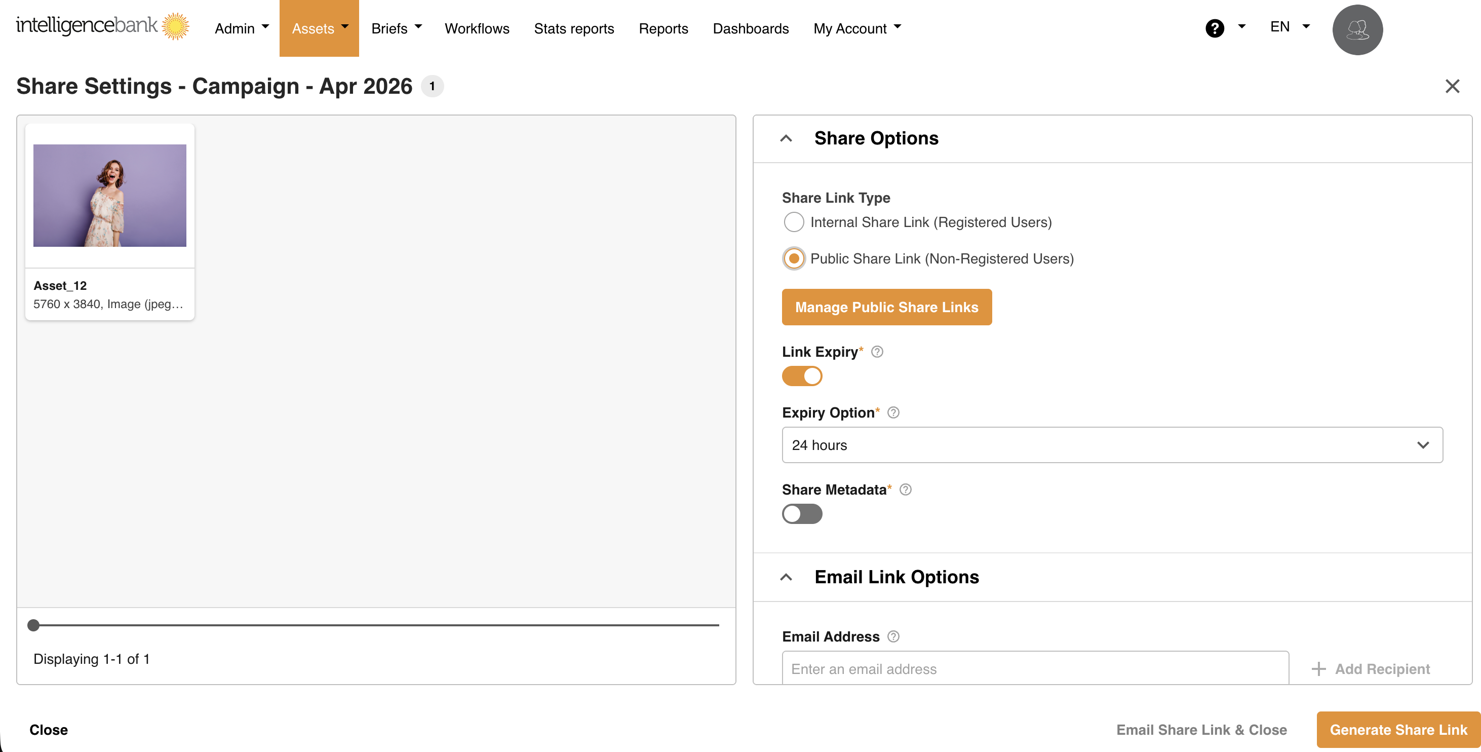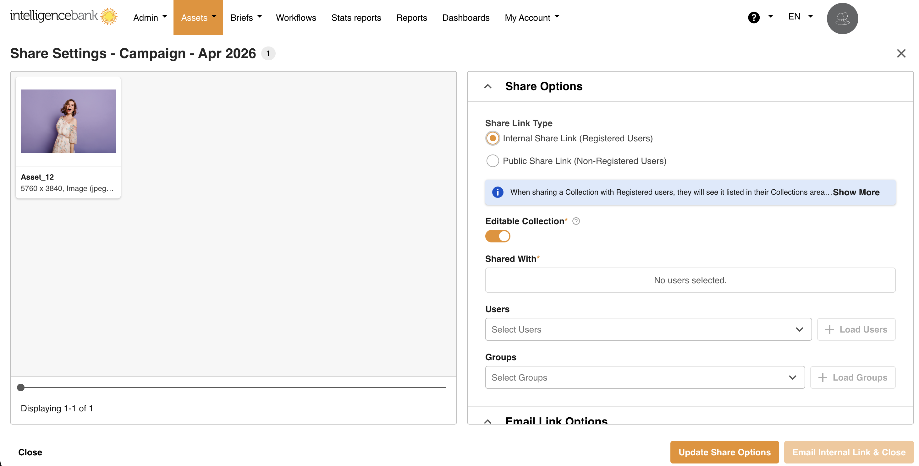 This opens the Share Settings page, which displays a preview of the assets in the collection on the left and the Share Options panel on the right. IntelligenceBank has two different share setting types: