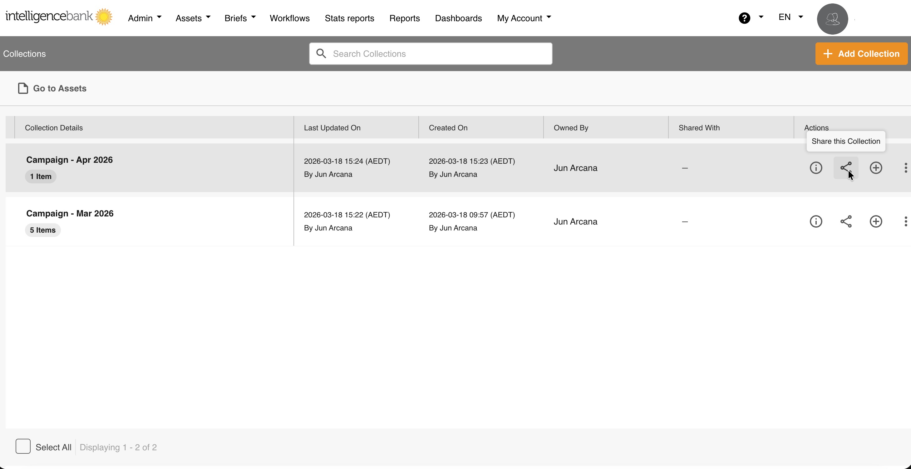 - From the Collections page, click the share icon in the Actions column next to the collection you want to share.