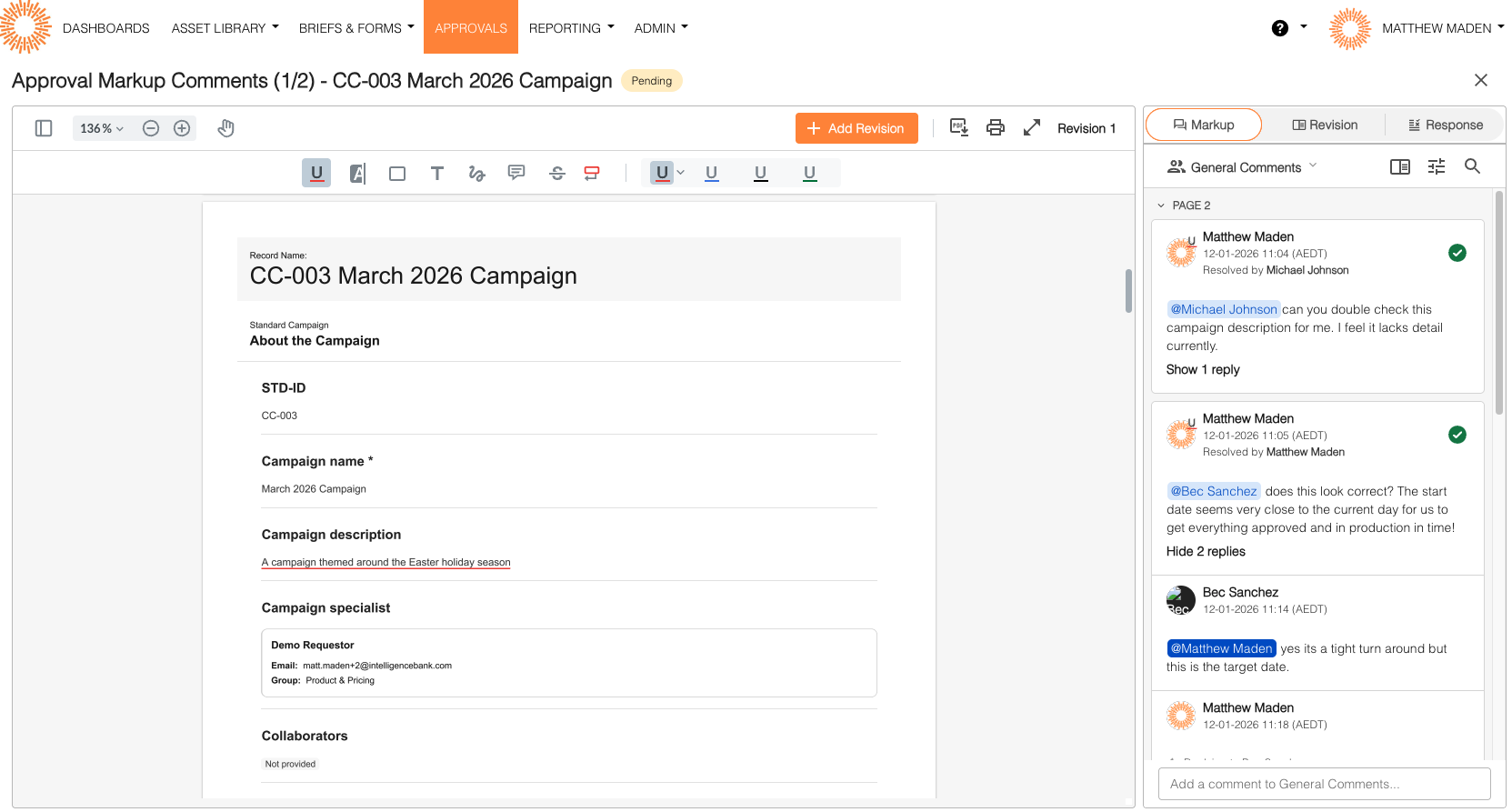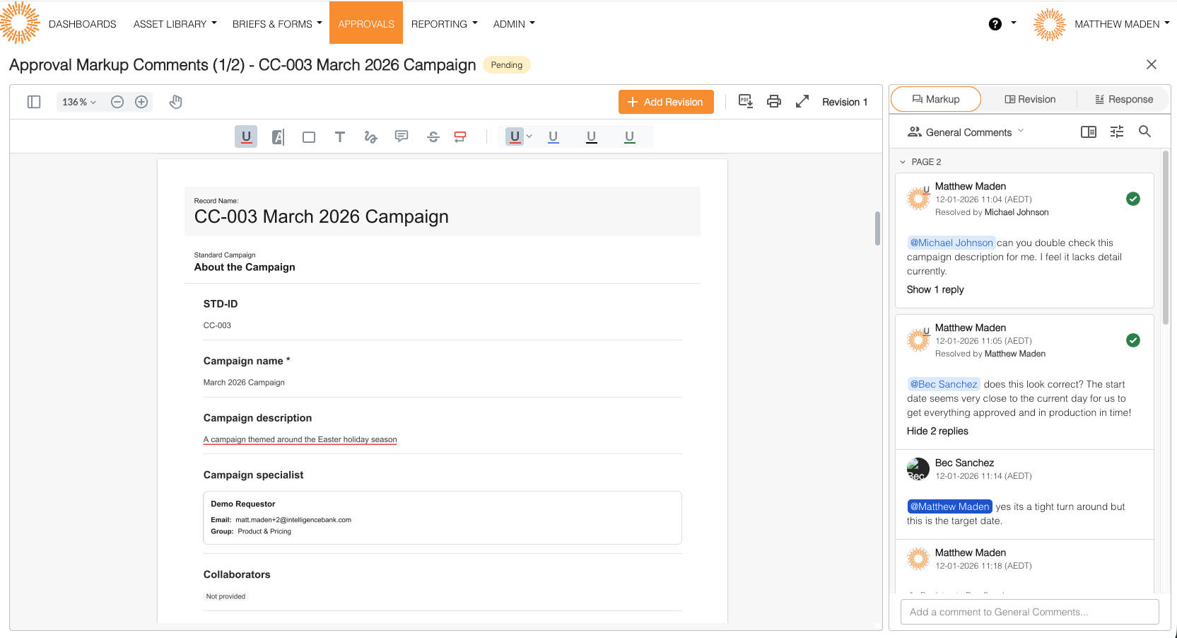 How it works: Add comments directly on Records or Approval Requests, reply to create threaded discussions, and use @mentions to notify specific users. For PDF files, you can add annotations directly on the document.