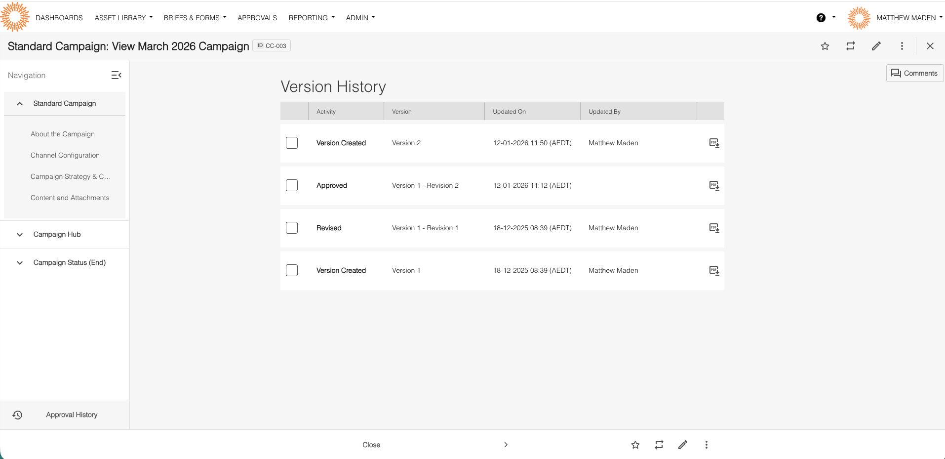 How it works: Every time a Record is edited (outside approval), a new version is created. Revisions made during approval also appear in Version History, nested under their parent versions. You can view, download, and compare any versions or revisions.