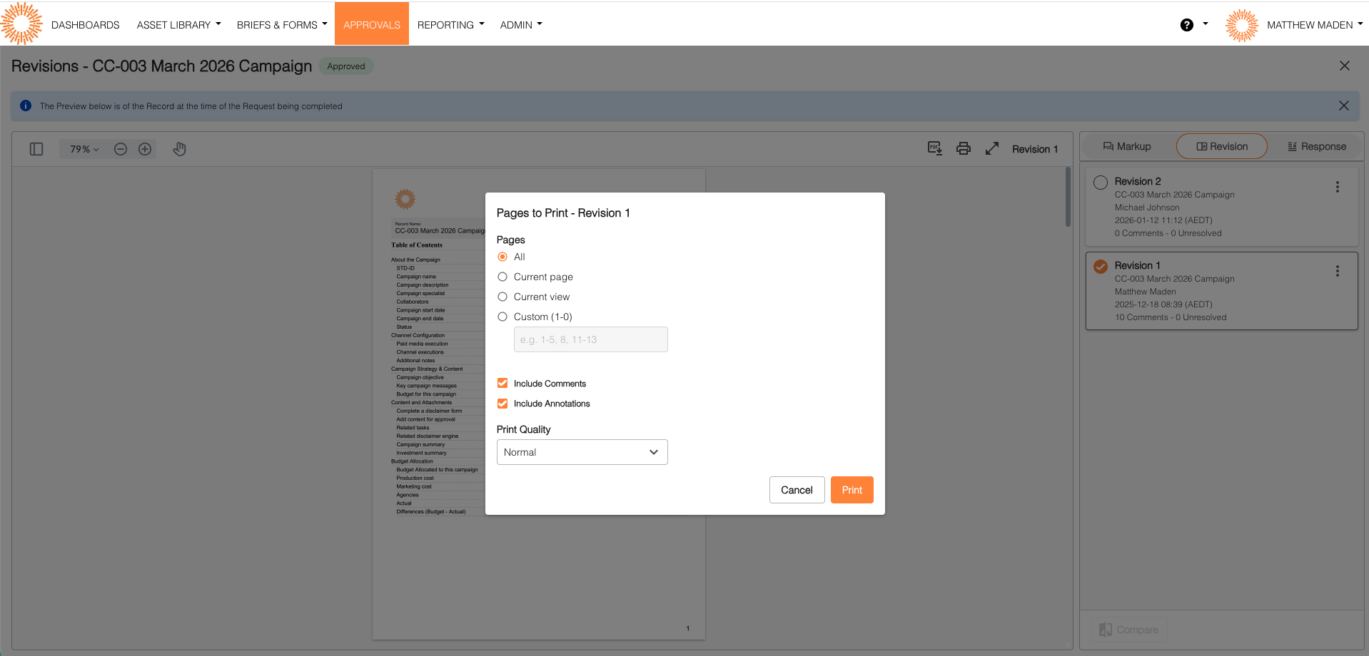 Automatic PDF snapshots are created when approvals complete, showing exactly what was approved.