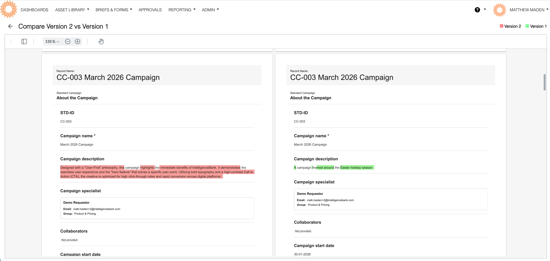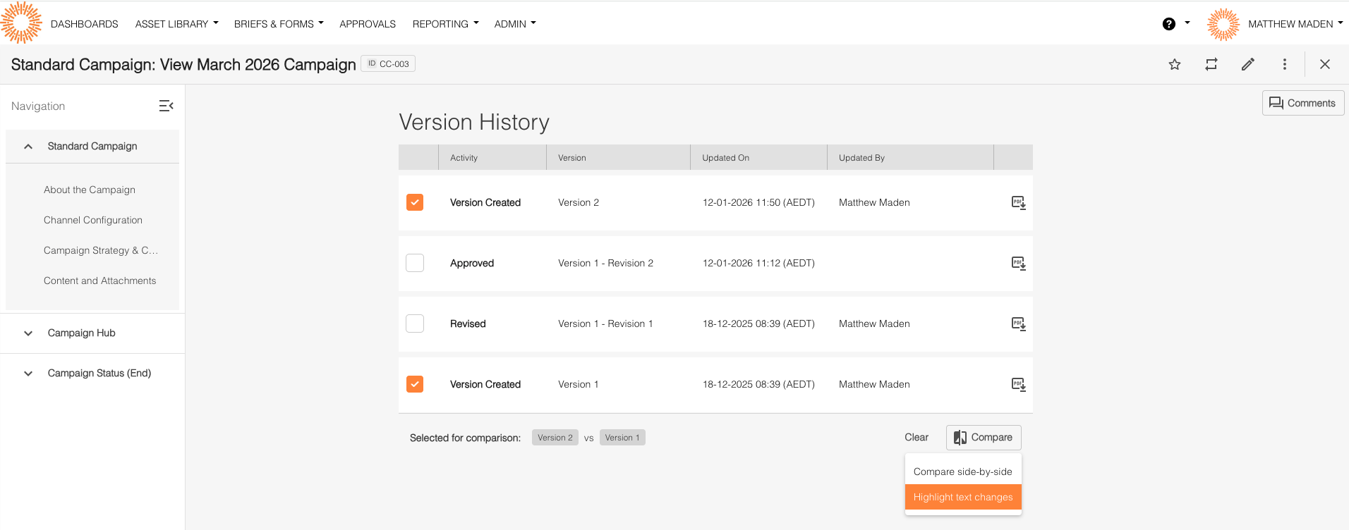 You can compare any two versions (or revisions) side-by-side to see what changed.