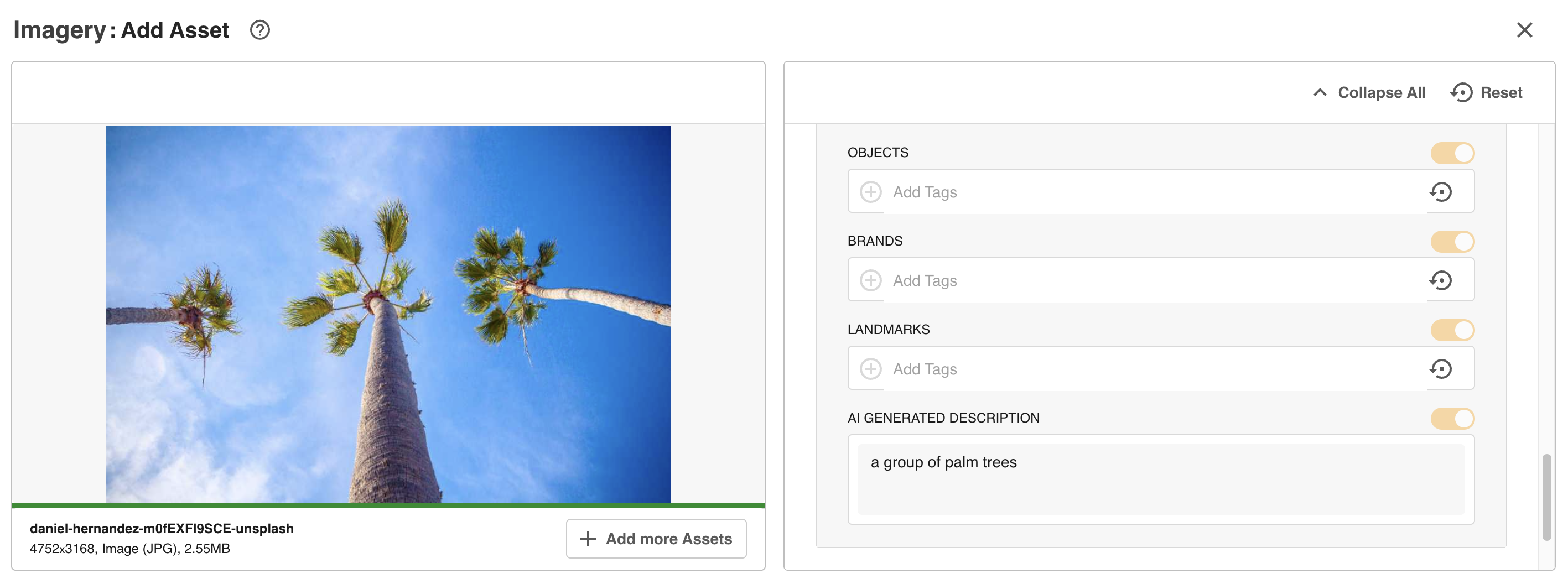 If your platform's settings allow for autotagging by default upon uploading assets, the AI Asset Description will generate when uploading images without you needing to toggle this feature on.