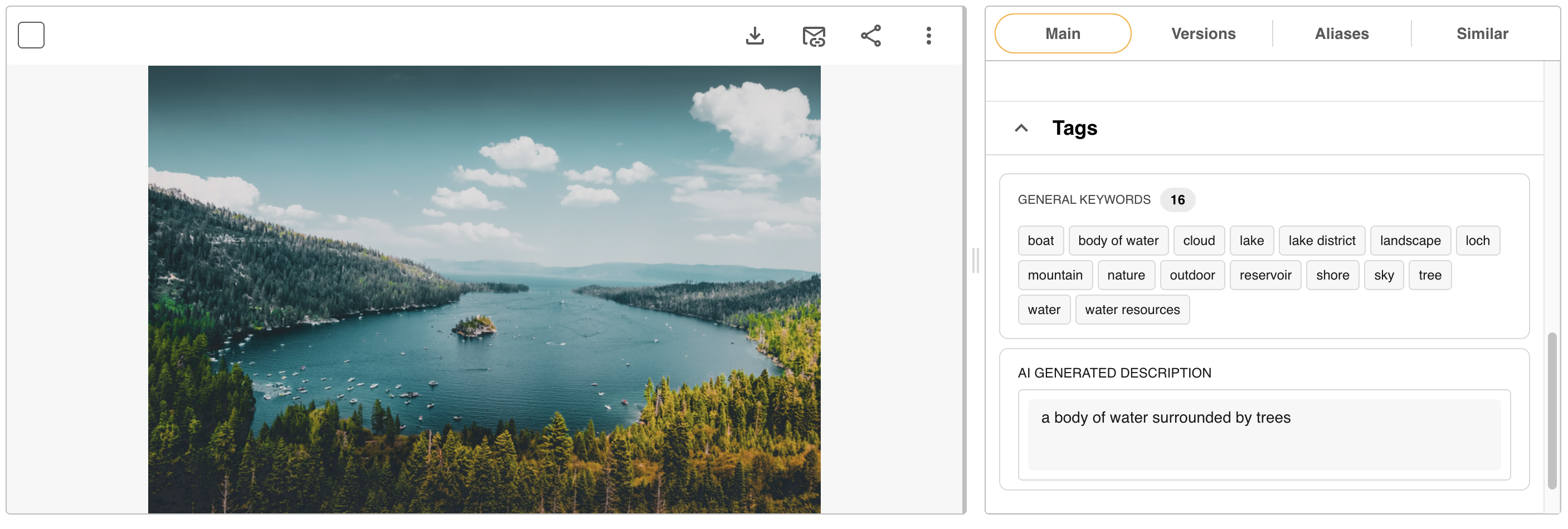 When enabled, AI Asset Description analyses your uploaded images and generates a text description of what the image contains. The description appears as read-only text in the Tags section of your images' Info Preview, Upload, and Edit pages. The AI-generated description is displayed separately from the description field found in the Main Details section (which is kept as a manual description,) so it never overwrites any of your image's existing descriptions.